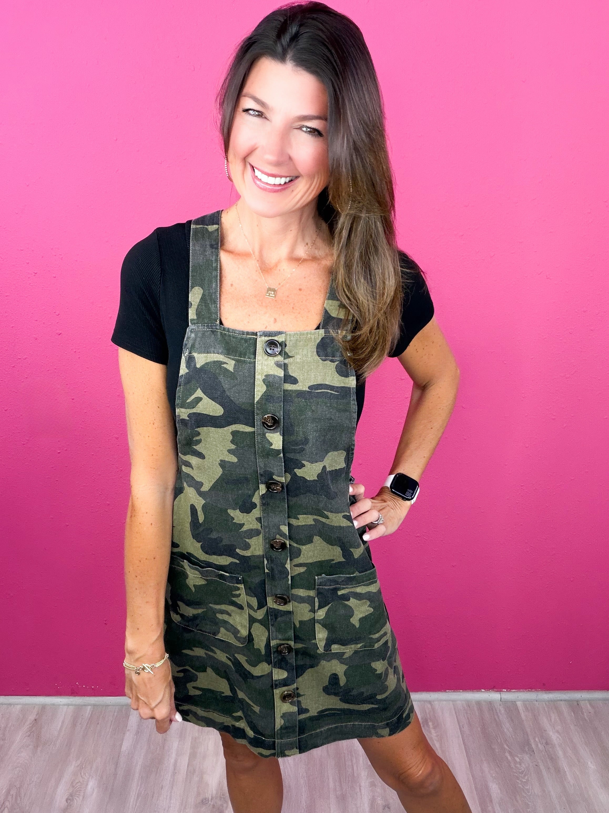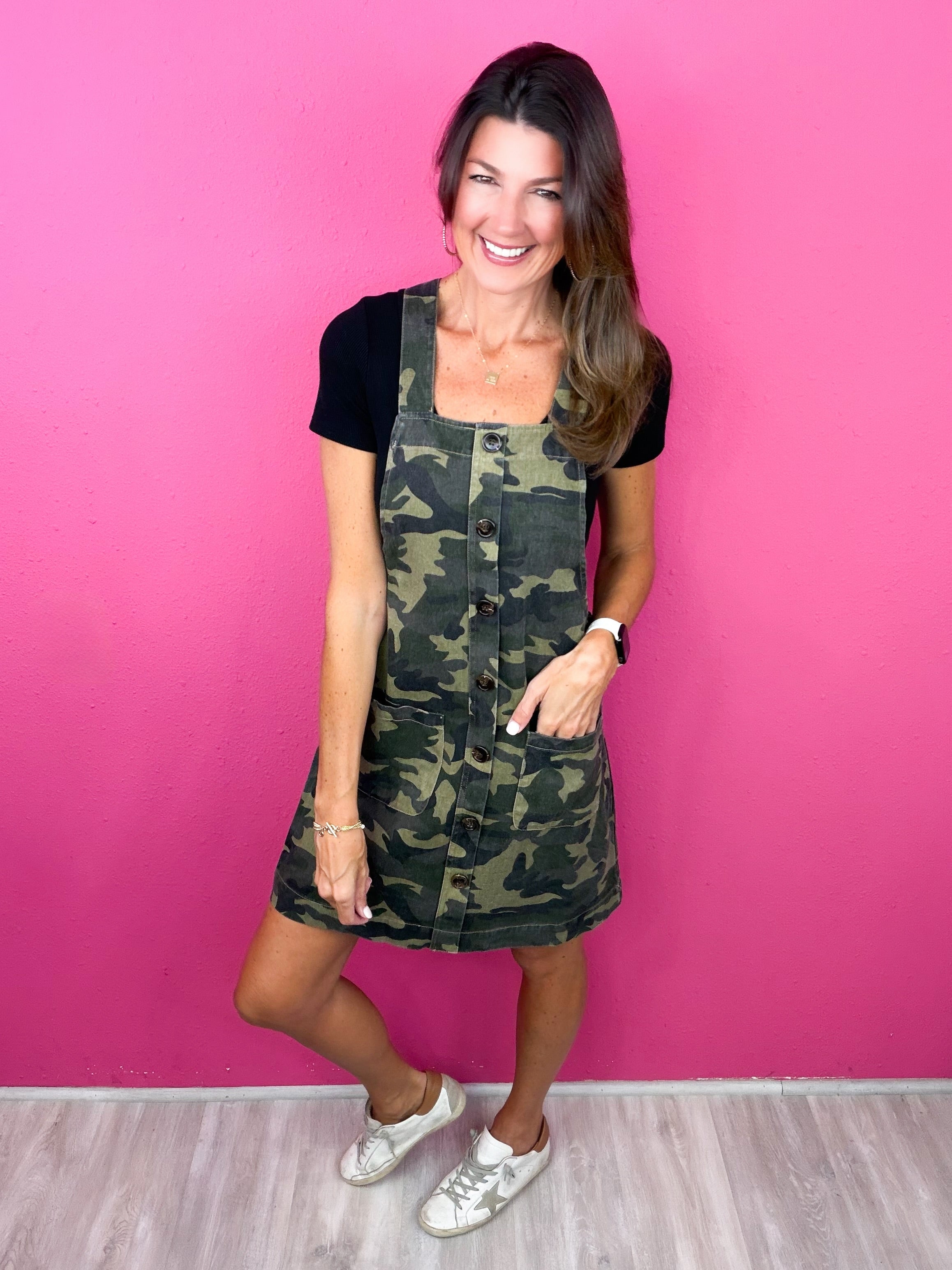 We are obsessing over this one! This camo overall style dress is the most fabulous throw on & go!