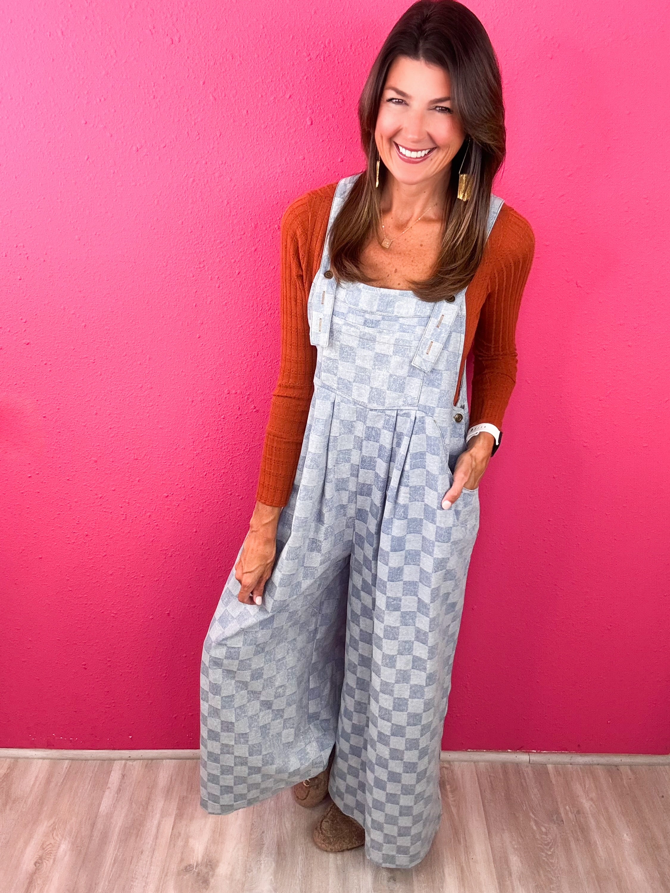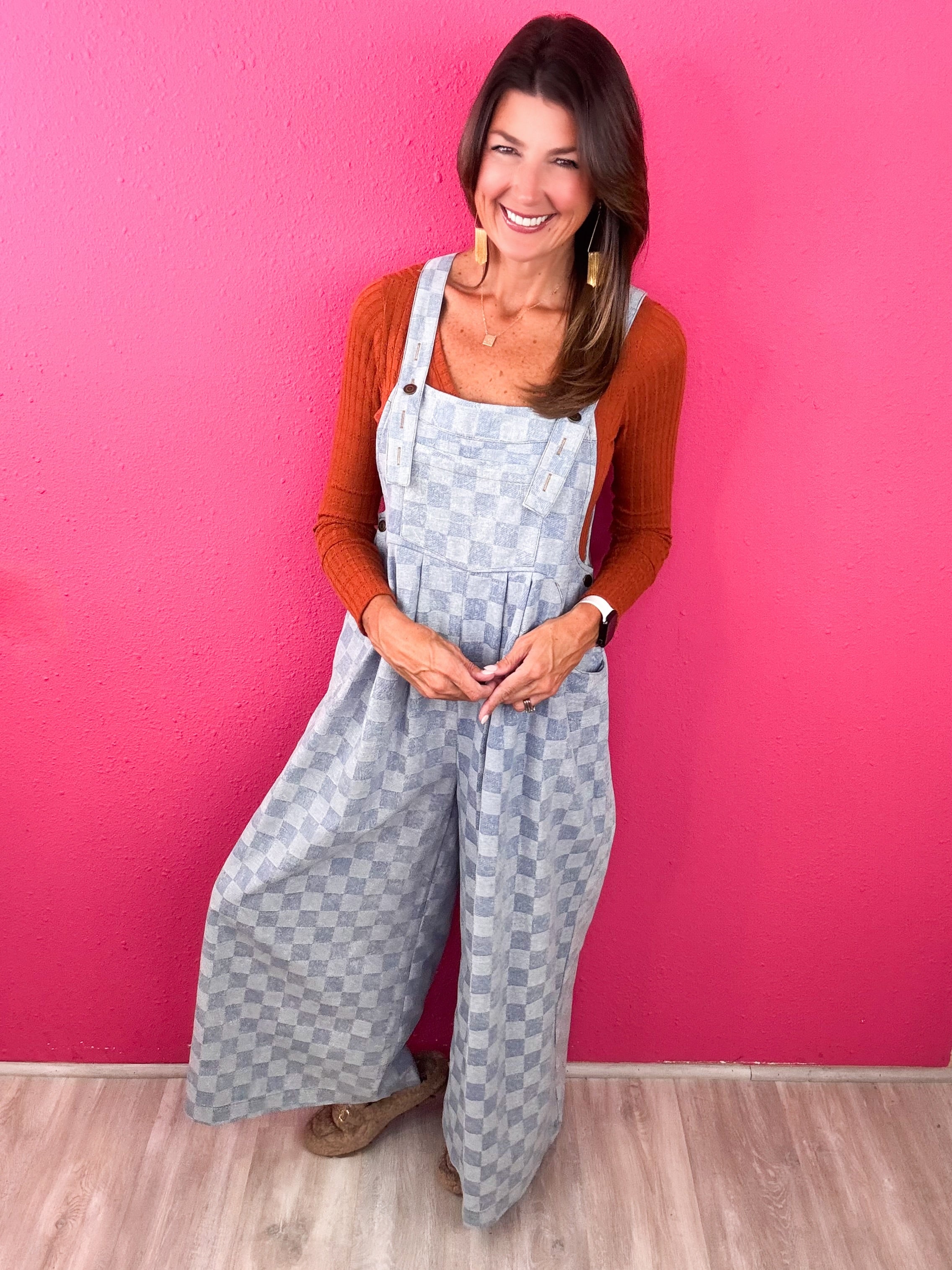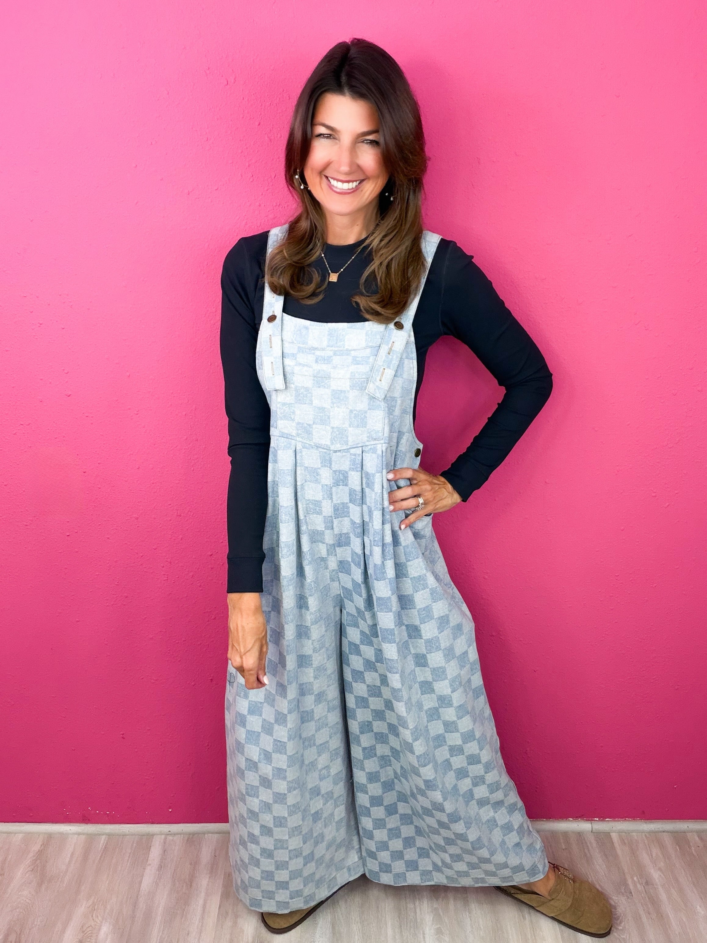 This checkered jumpsuit checks ALL of our boxes! This cutie is so comfortable, can be styled through the season and keeps you up to trend!