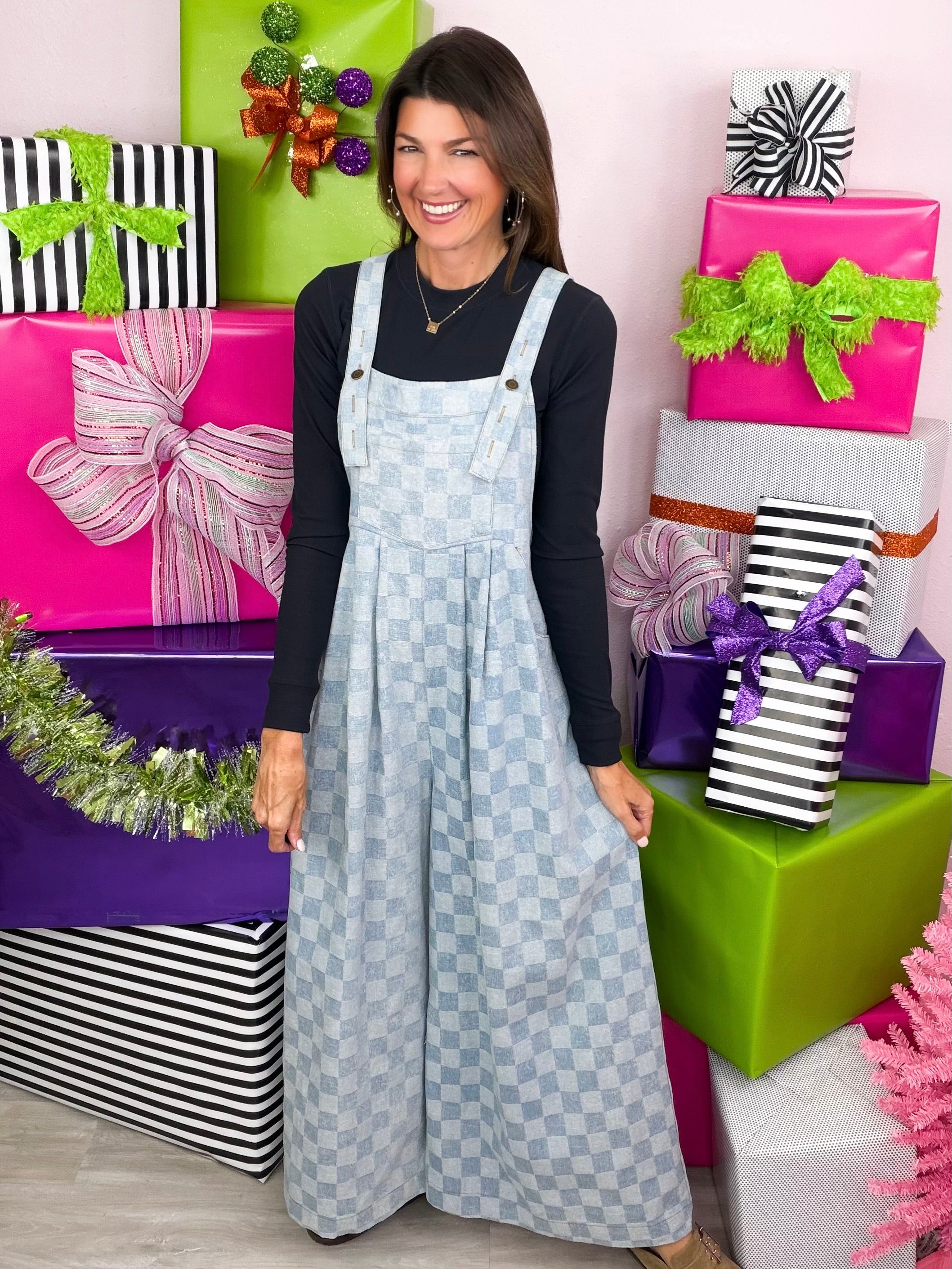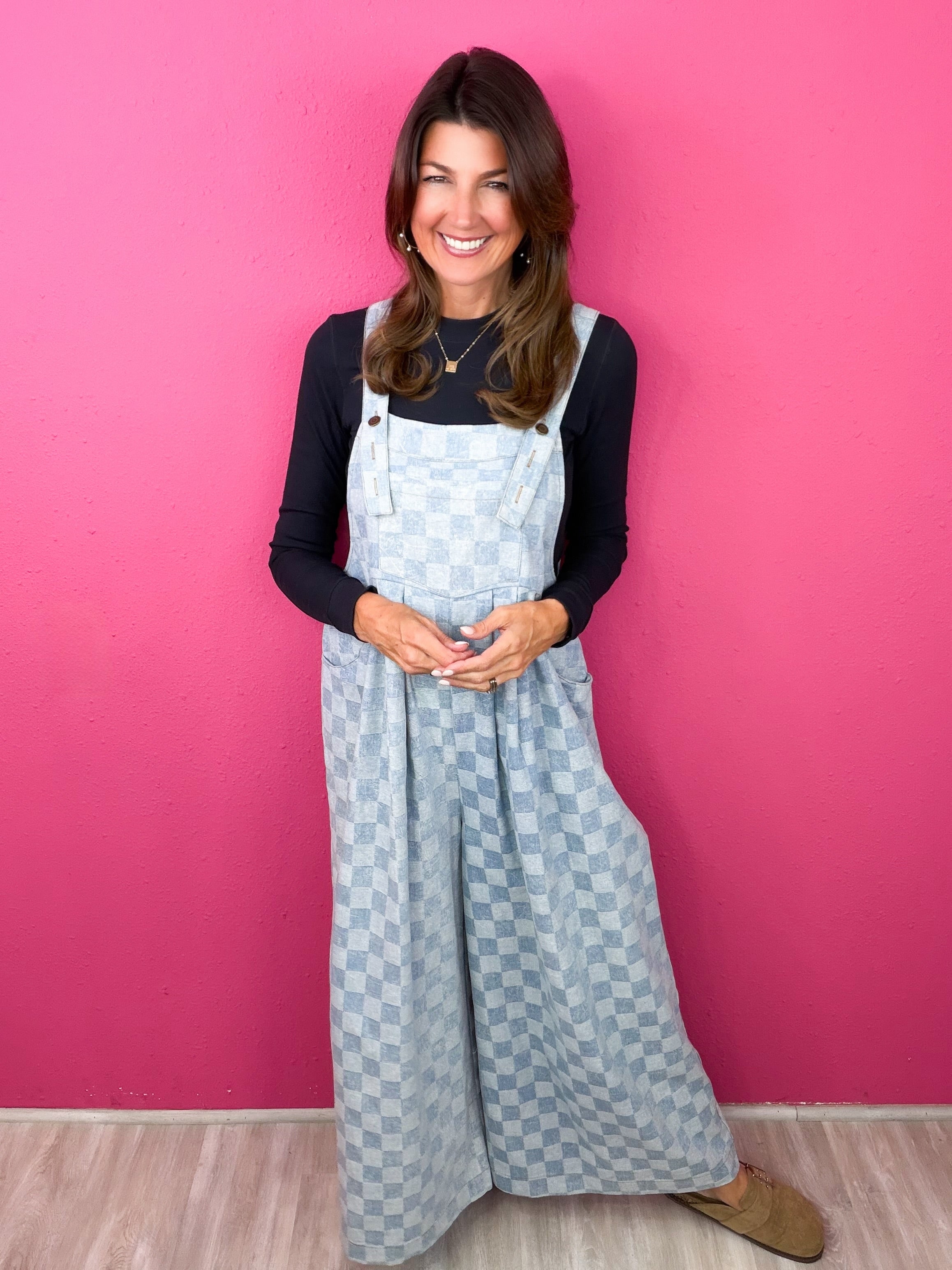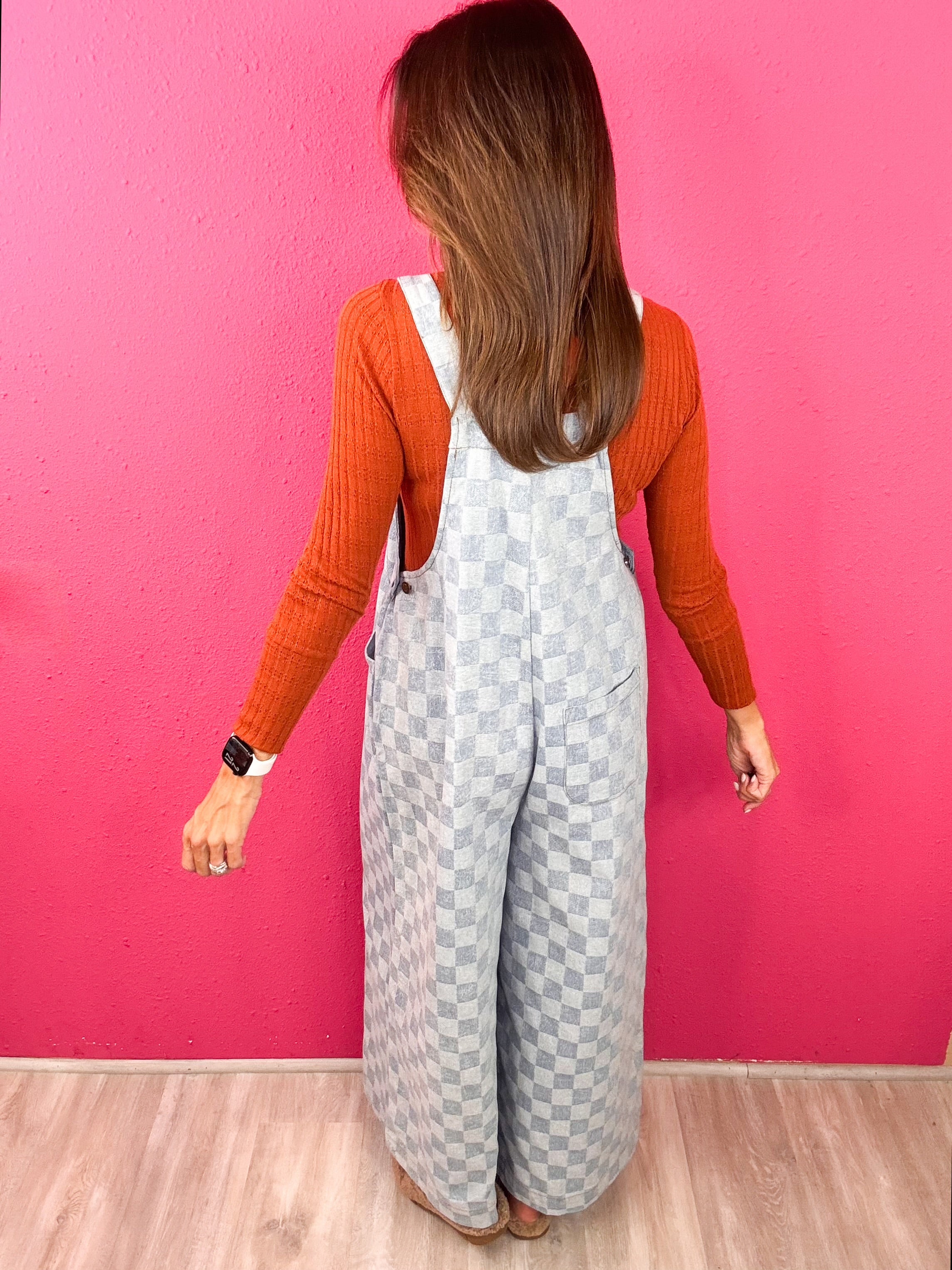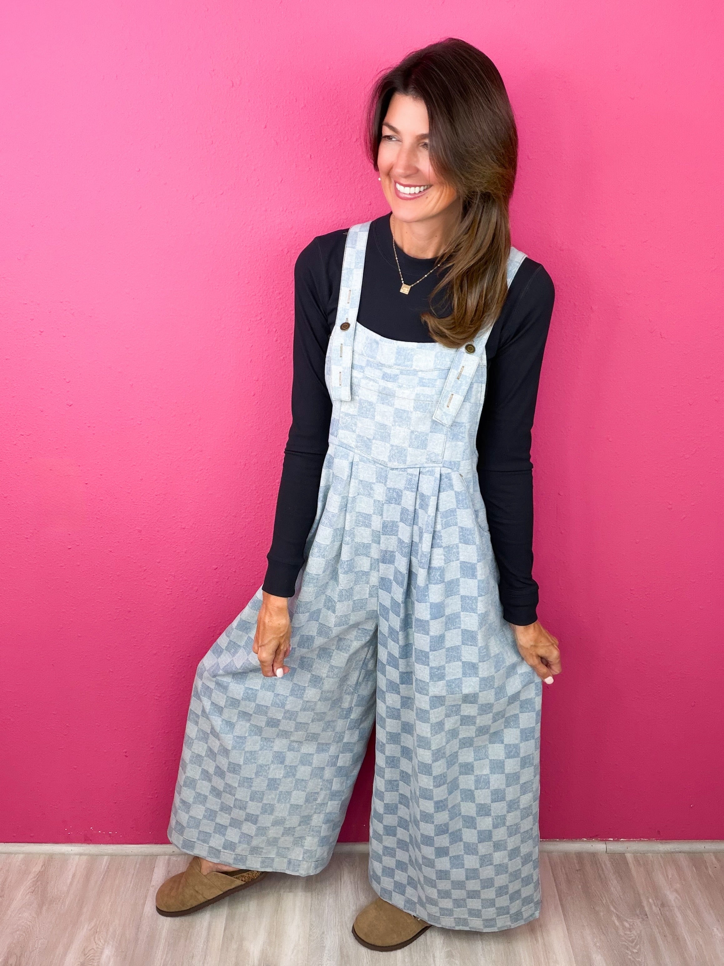 This checkered jumpsuit checks ALL of our boxes! This cutie is so comfortable, can be styled through the season and keeps you up to trend!