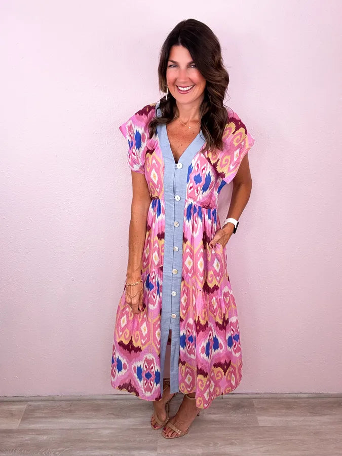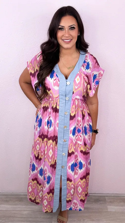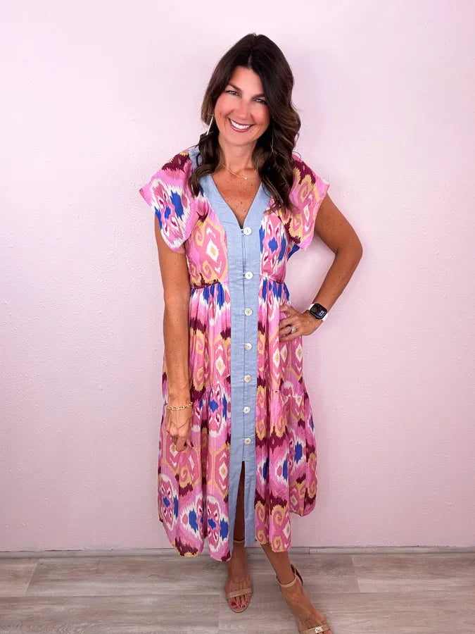 This midi is easy to fall in love with! Adoring this abstract pattern and the denim trim is top tier- unlike the rest!
