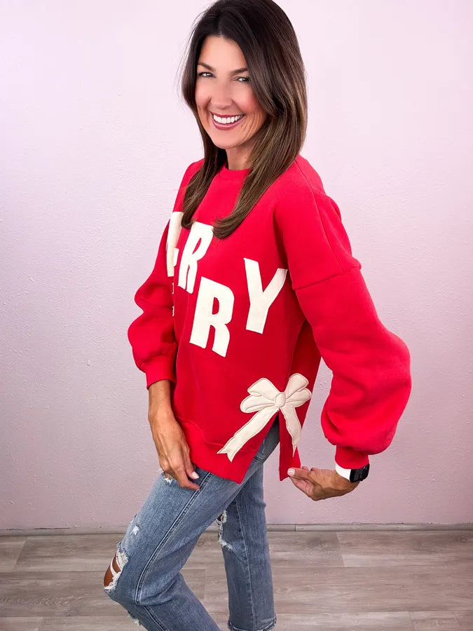 Tis the season for cute graphics! This merry pullover is an easy favorite and we are adoring the bow details on this one!