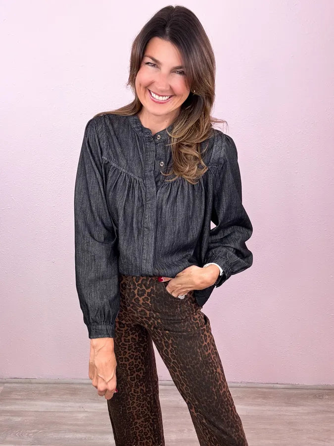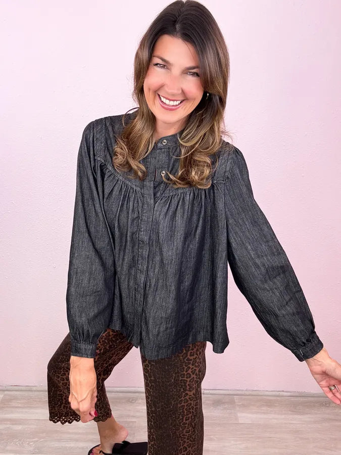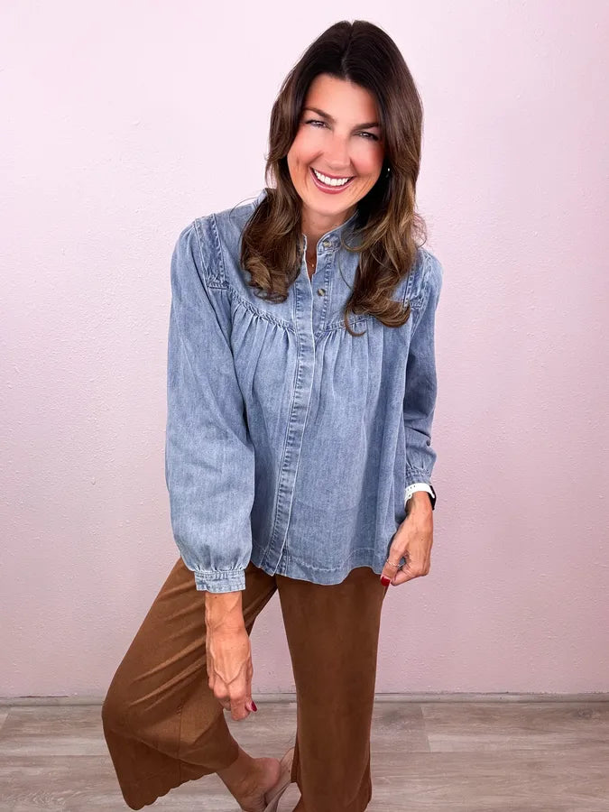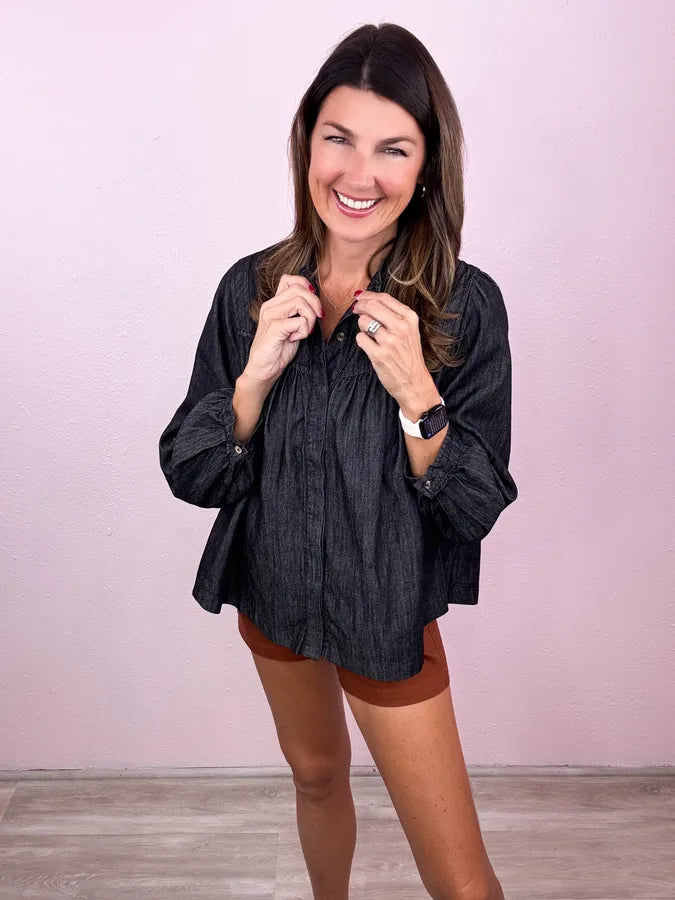 Time to update your go-to denim top! Meet your new favorite - totally cute as a buttoned up denim top or just as cute open as a layer!