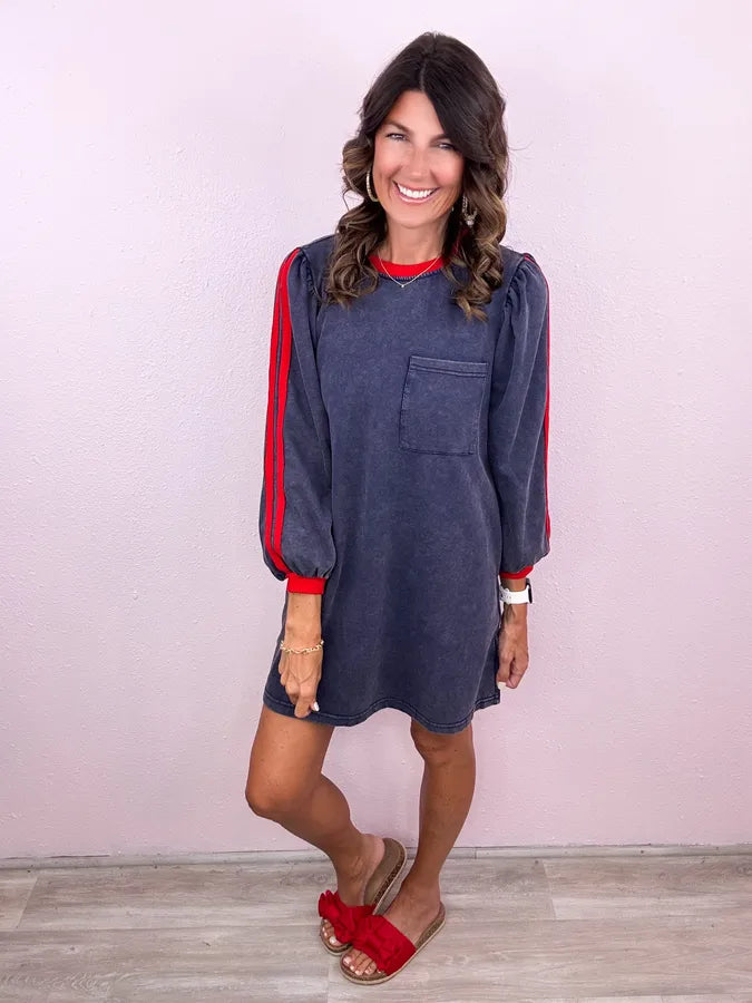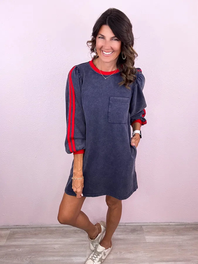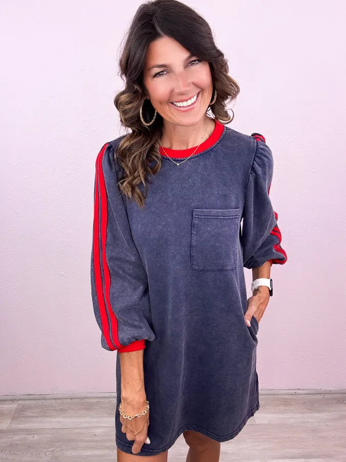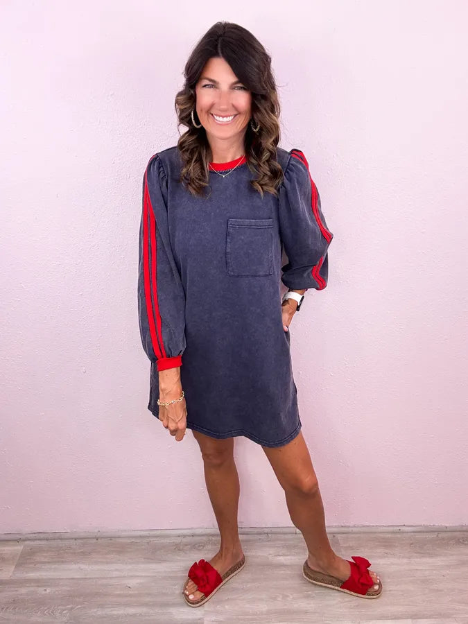 The most wonderful dress for the season! This gem could not be more comfortable, the washed fabric is 10/10 and we adore the varsity stripe details!