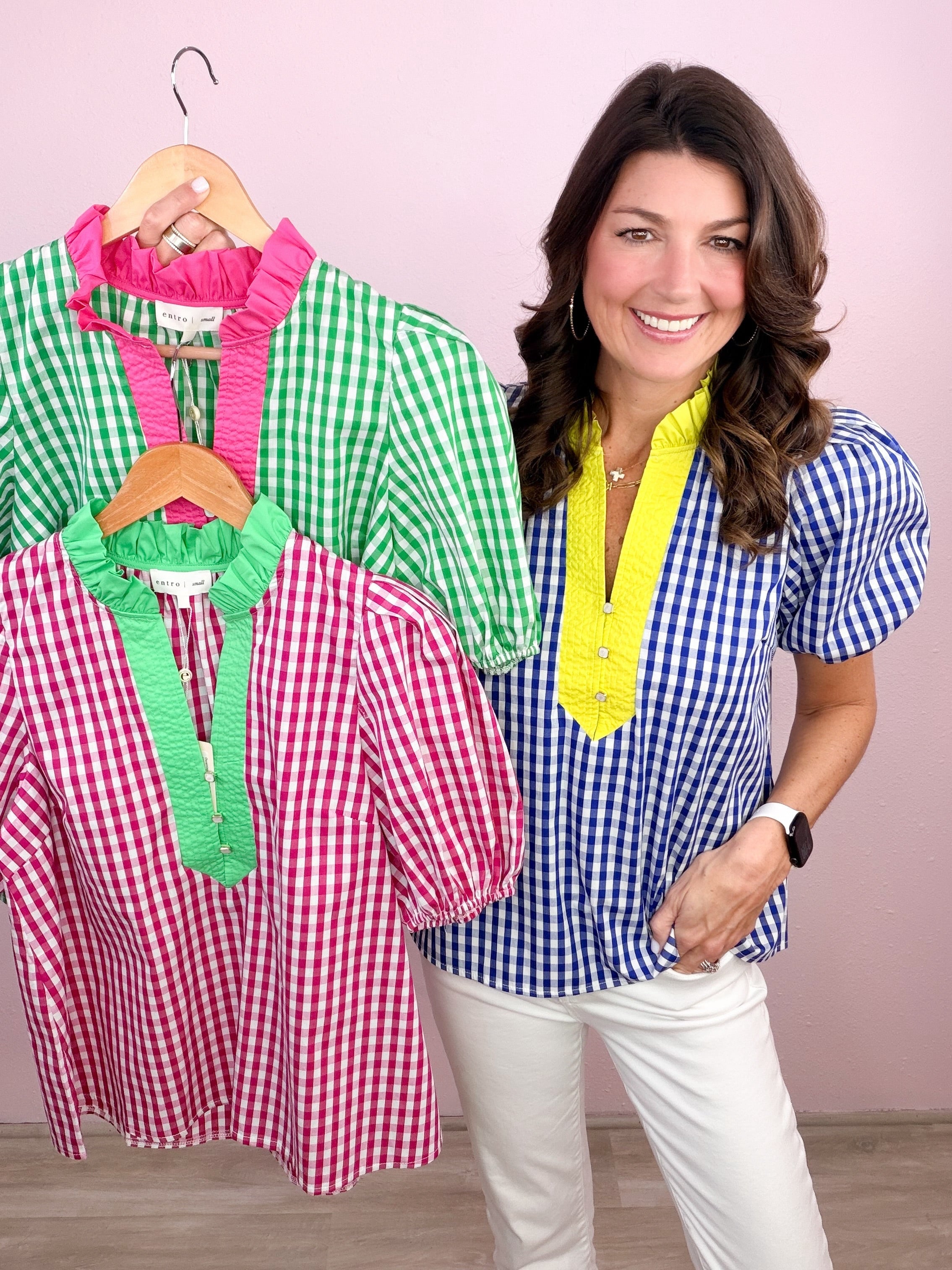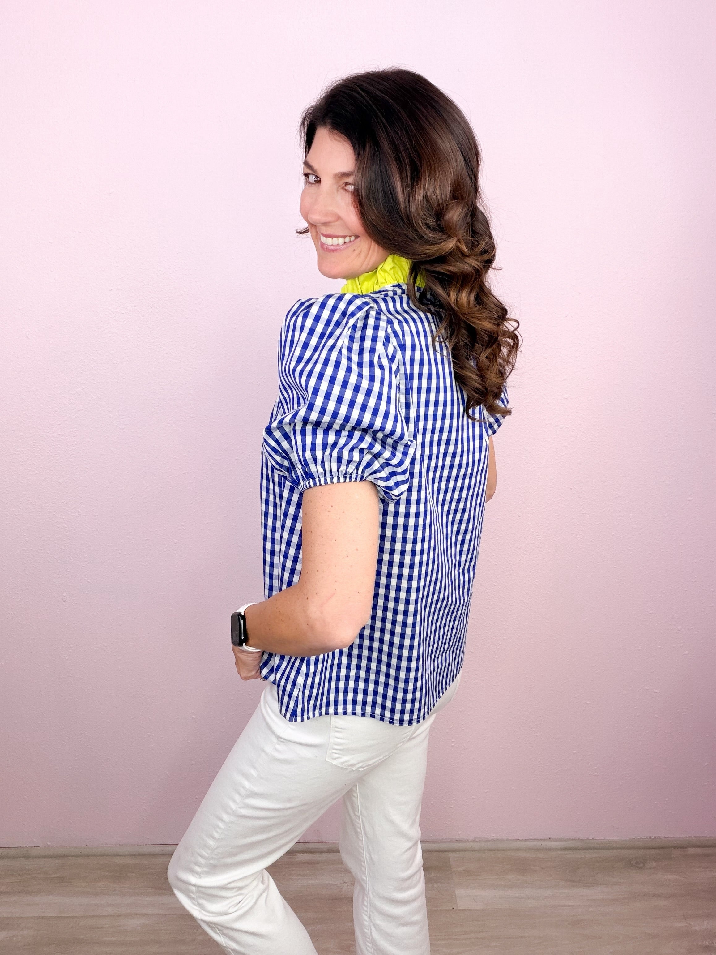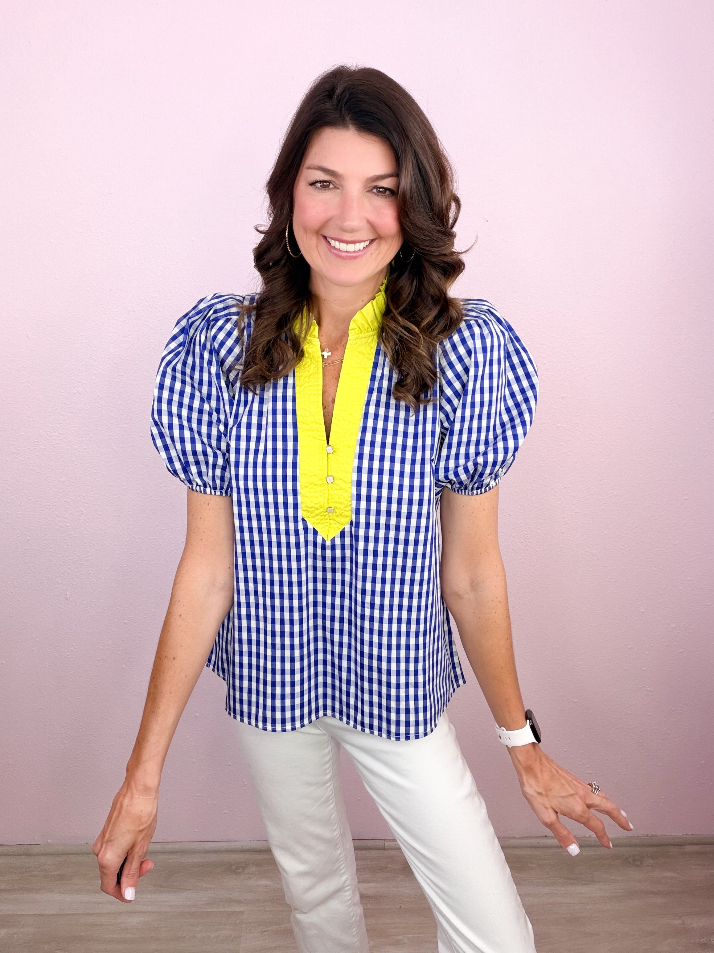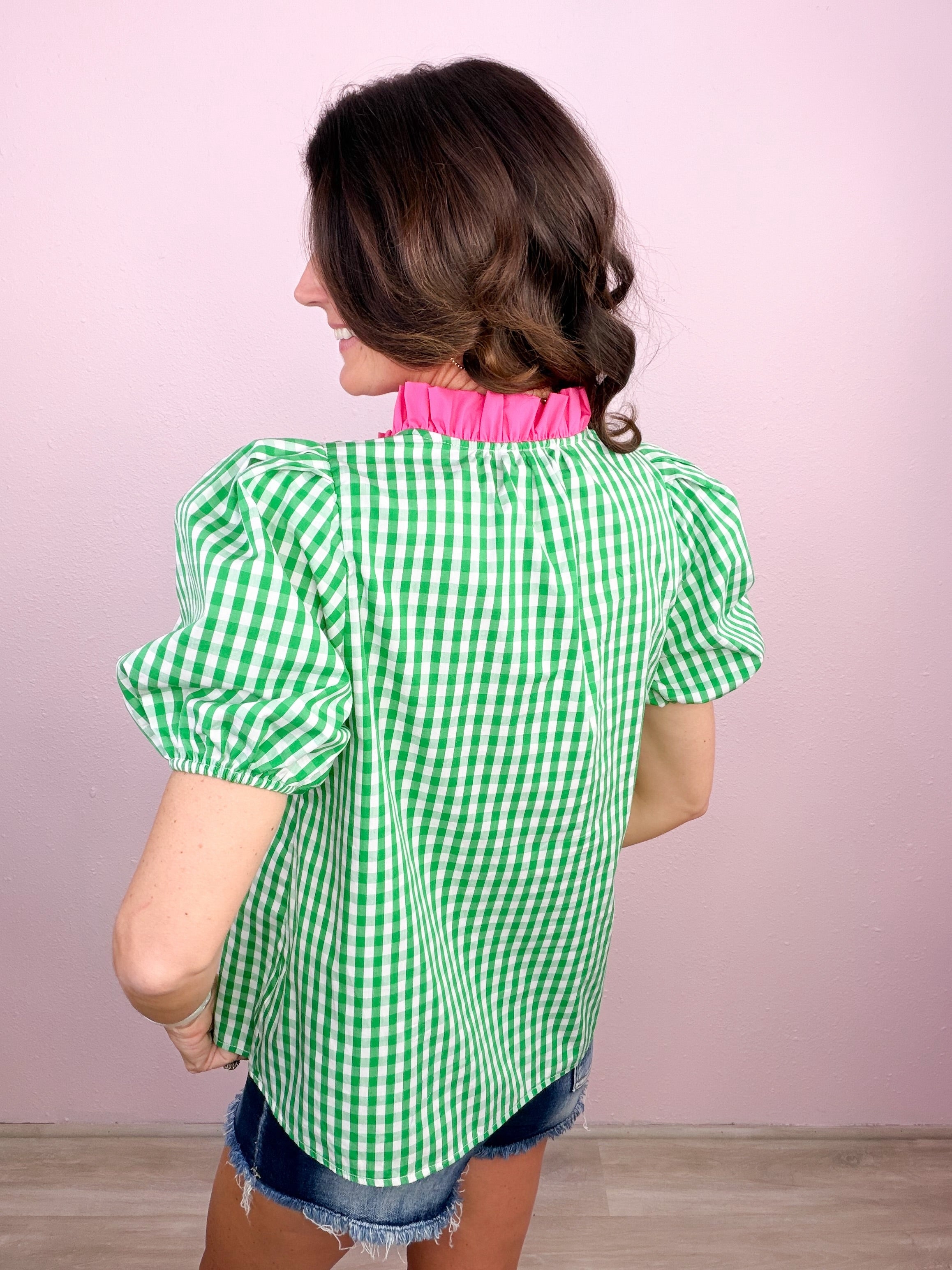 - Ruffled + contrast split neckline