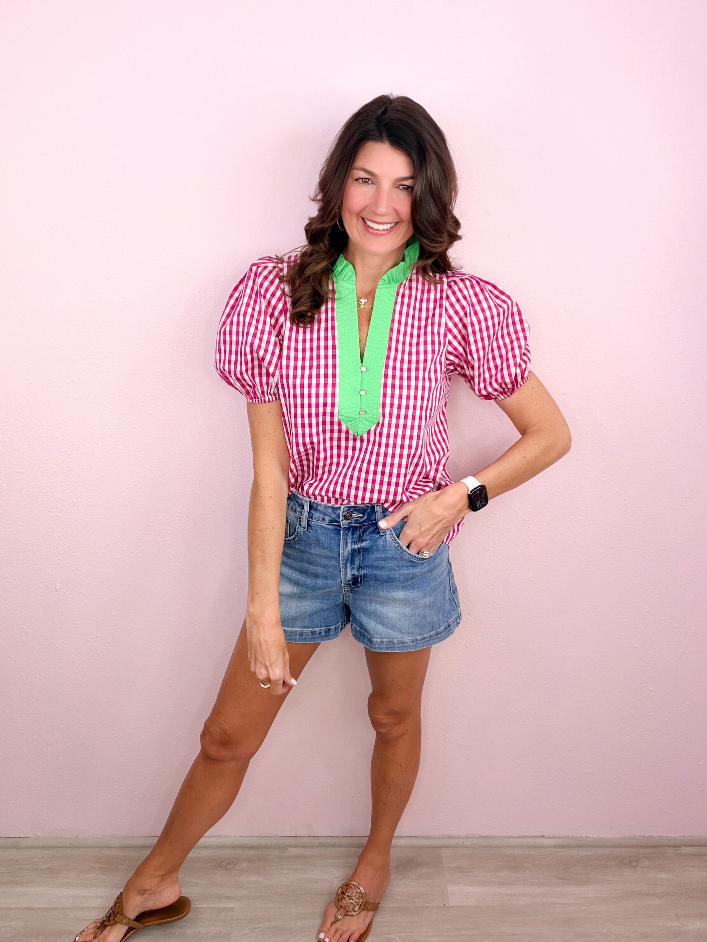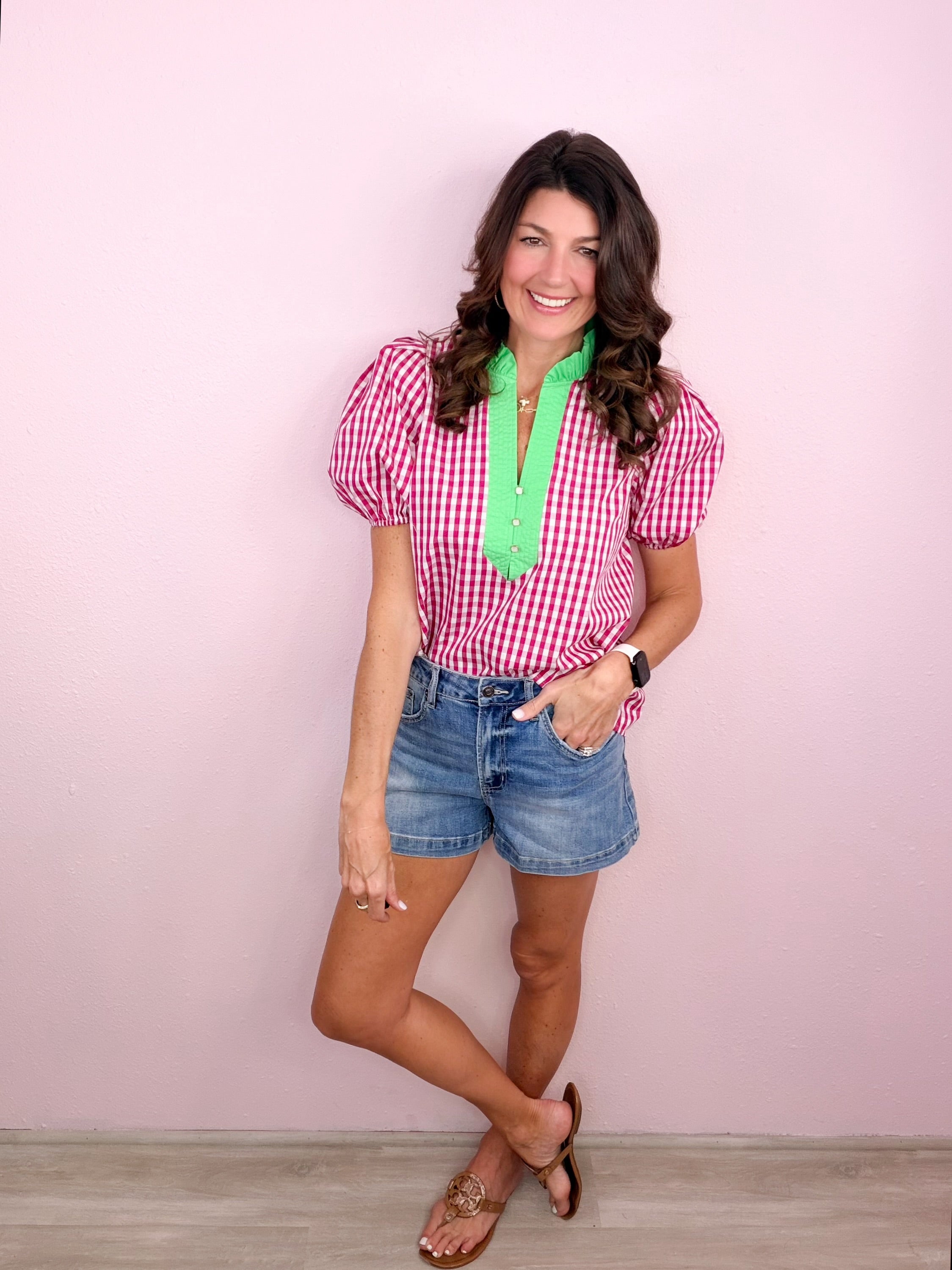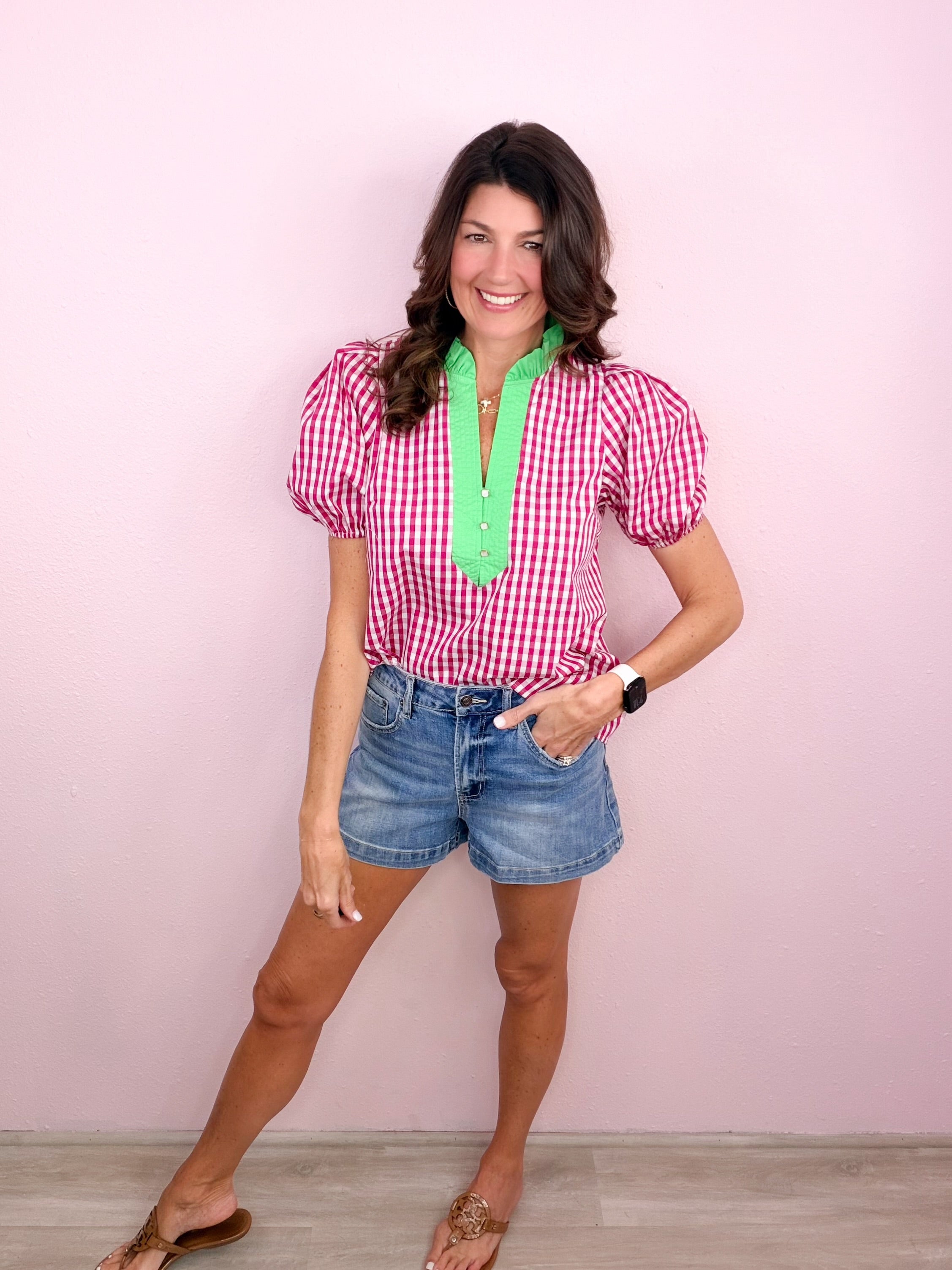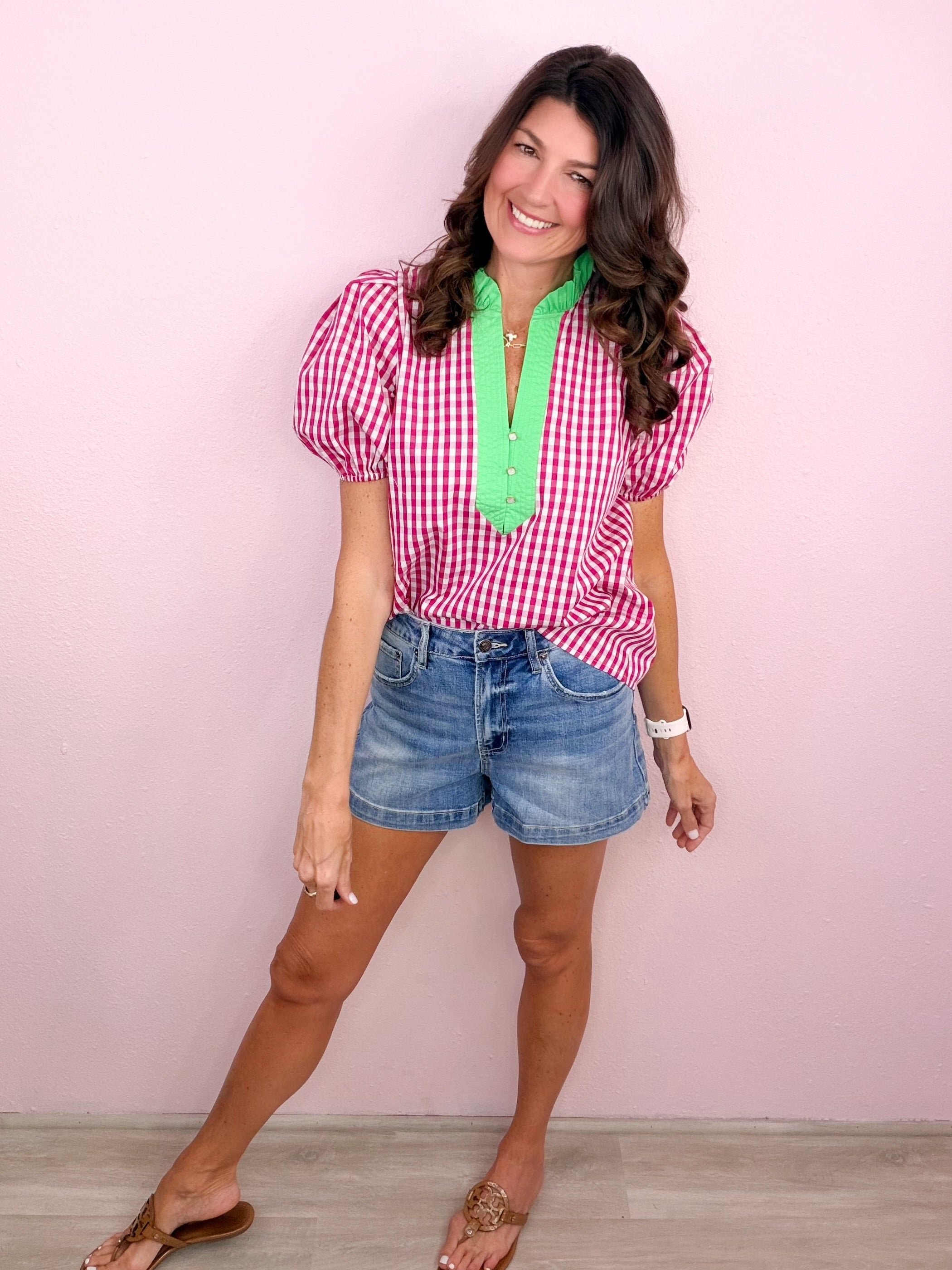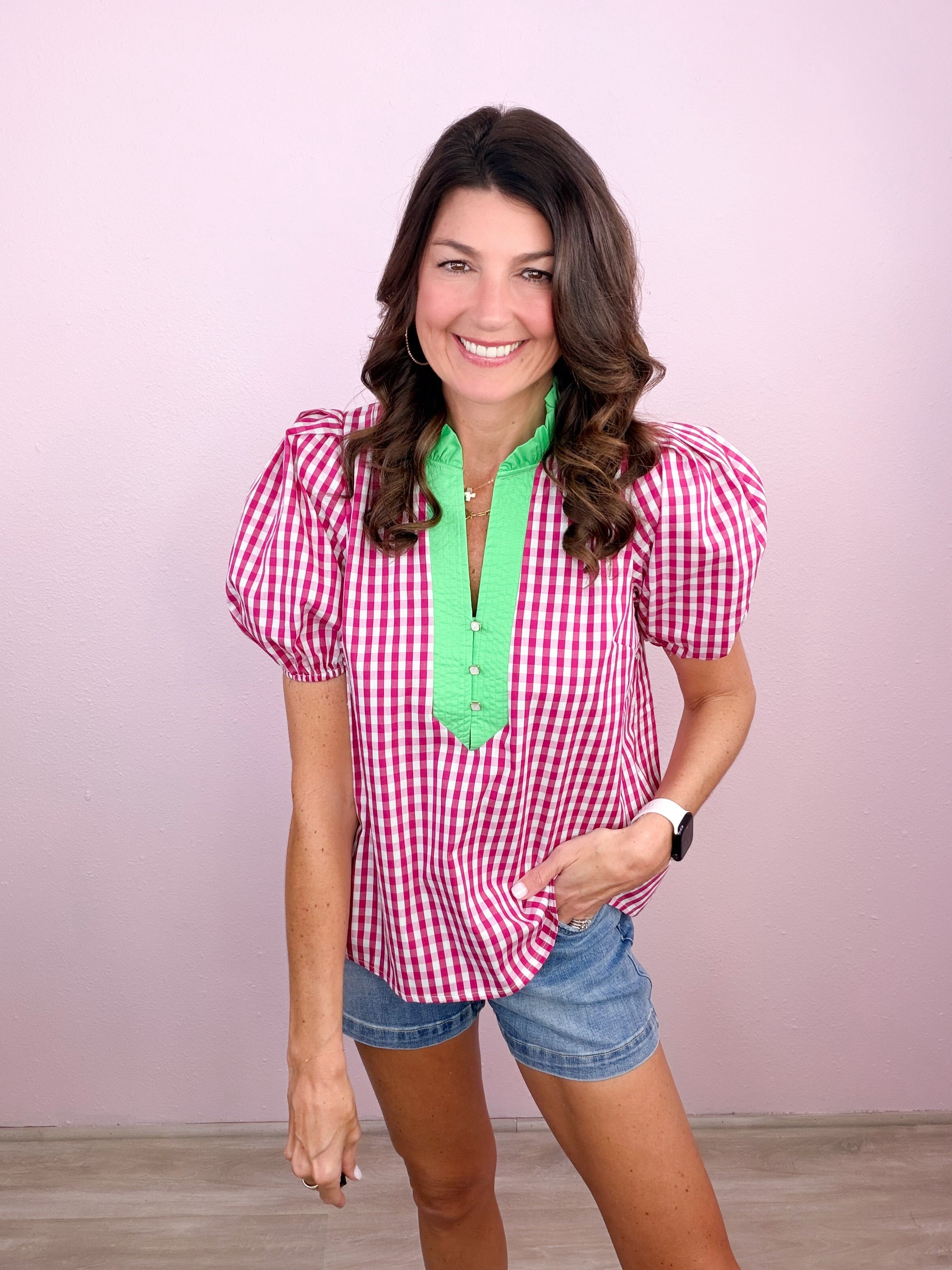 - Ruffled + contrast split neckline