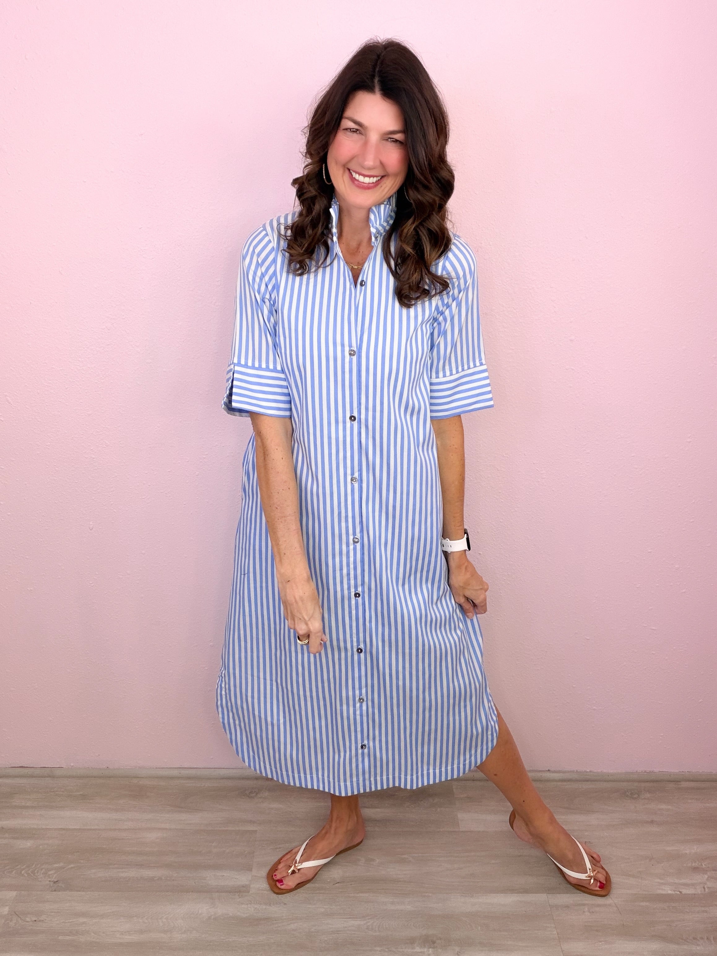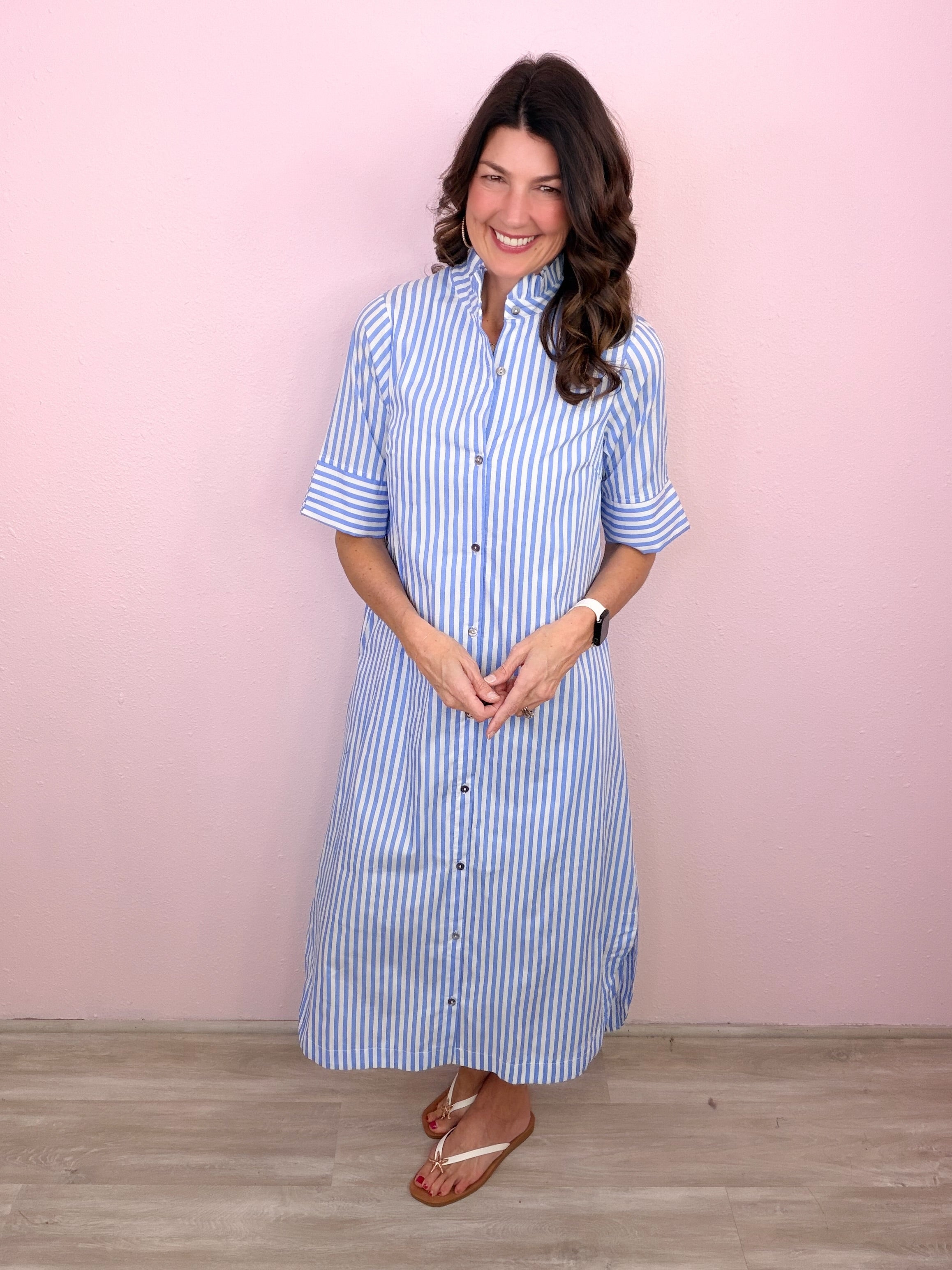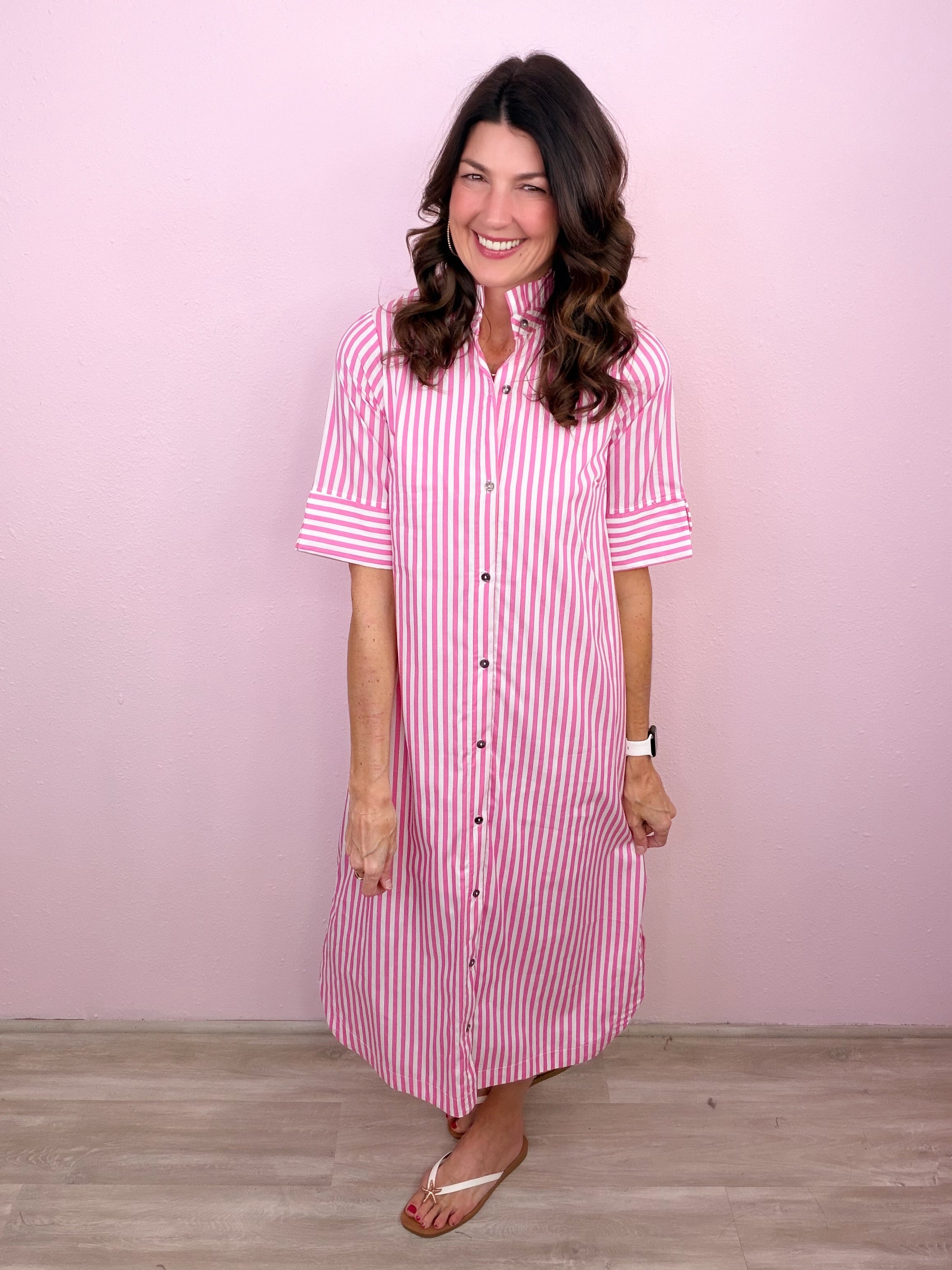 Classic stripes meet an effortless button-down design for a midi dress you’ll reach for again and again!