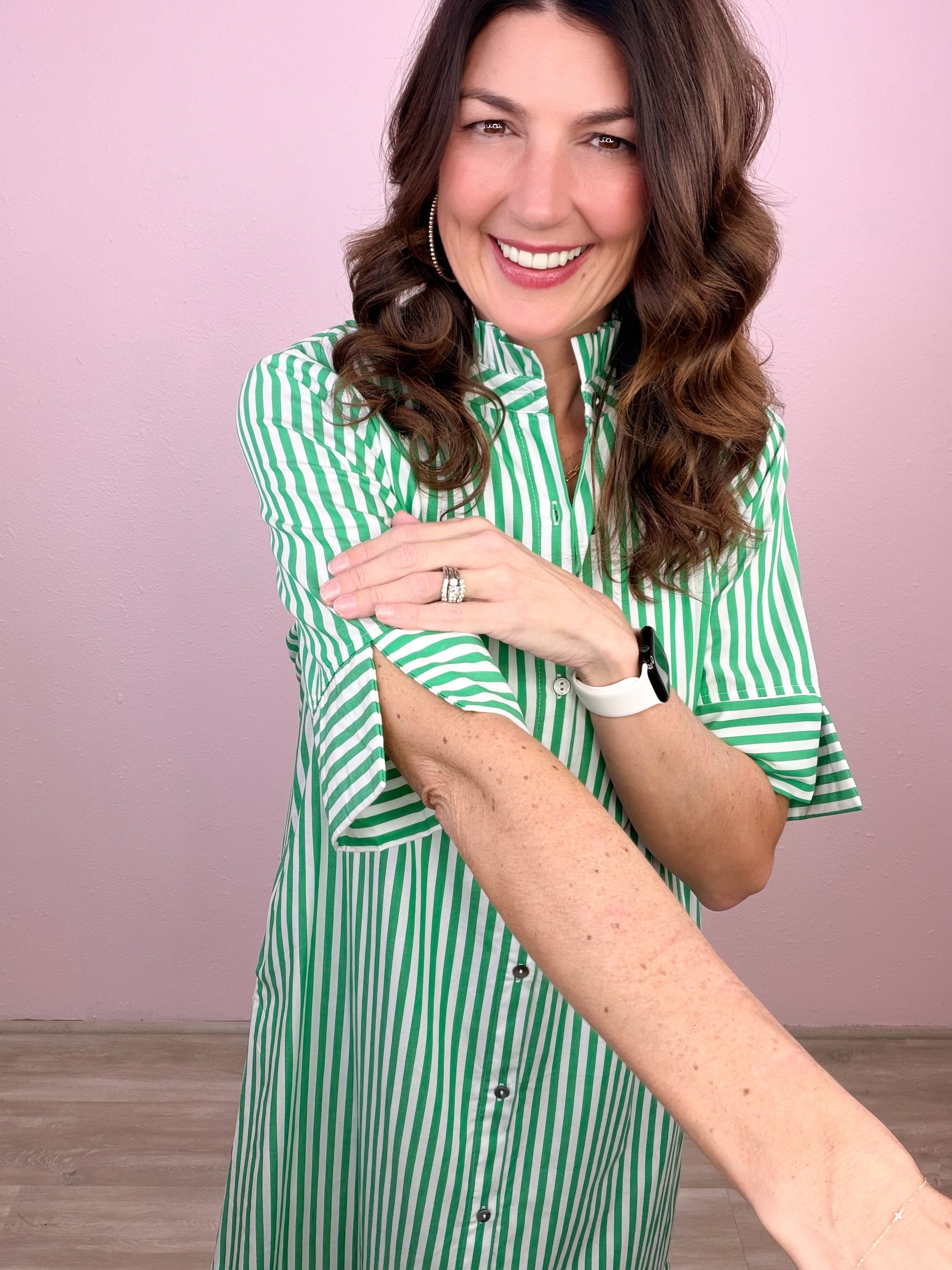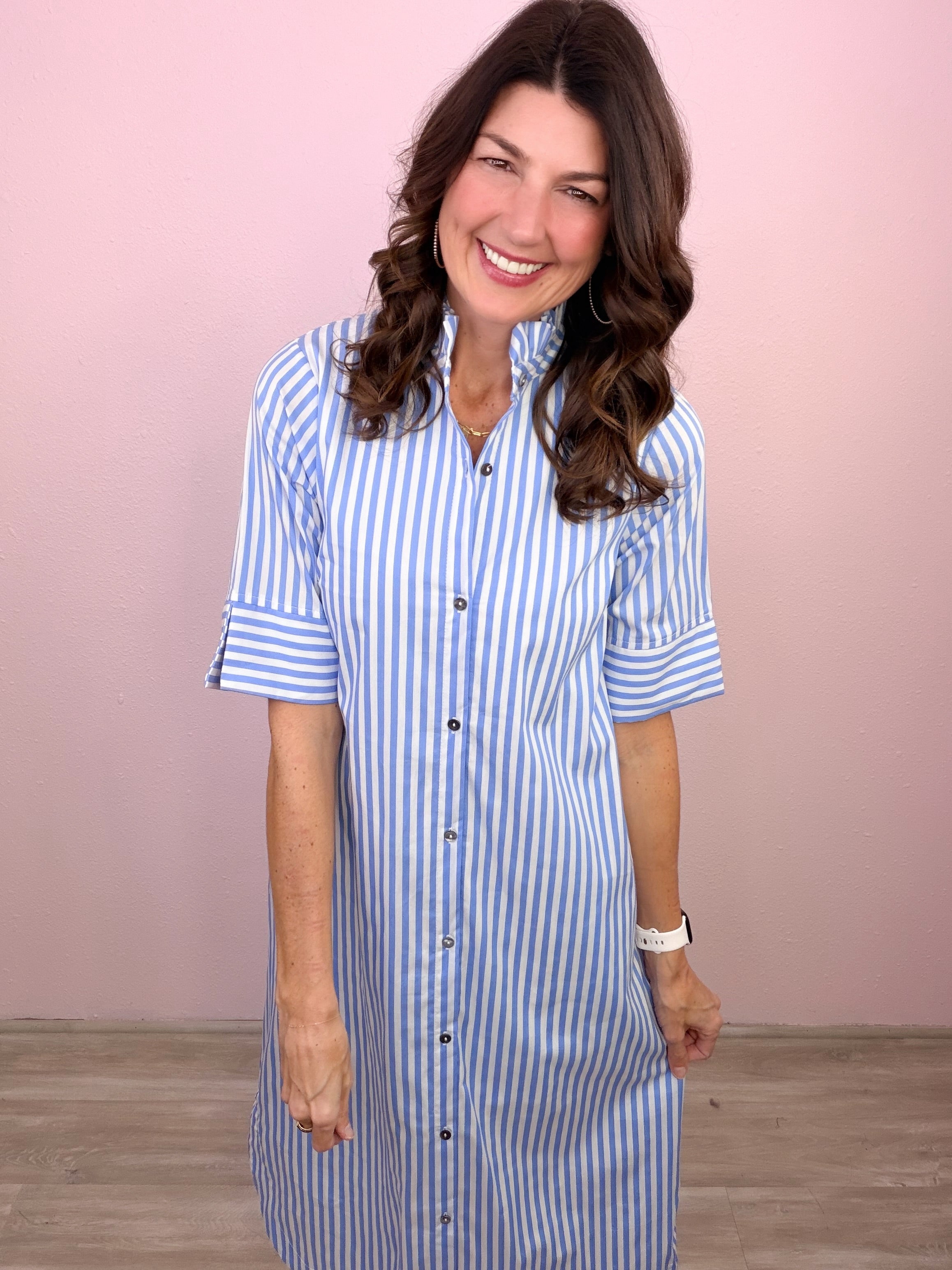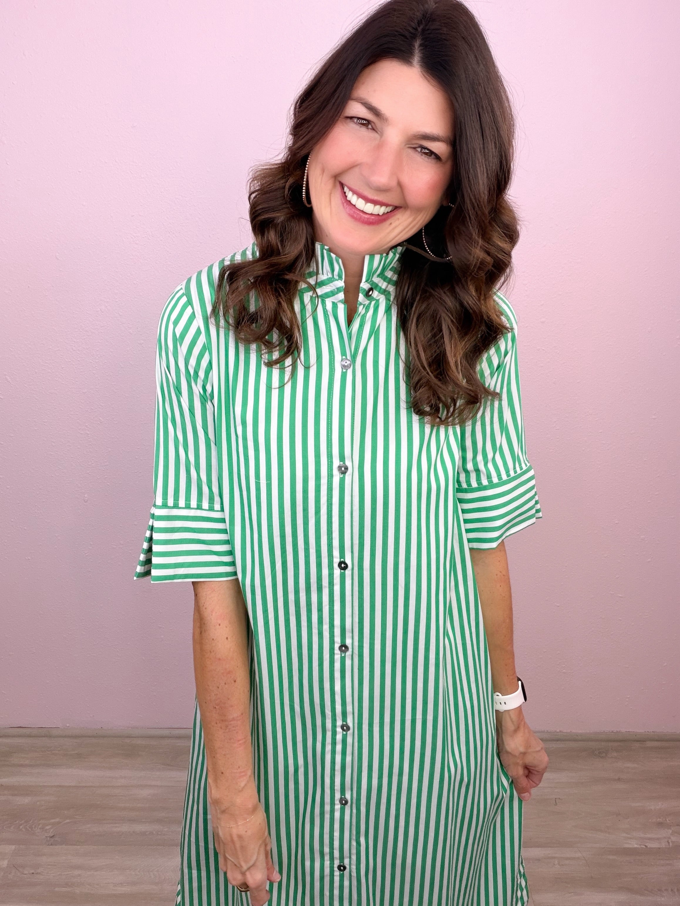 Classic stripes meet an effortless button-down design for a midi dress you’ll reach for again and again!