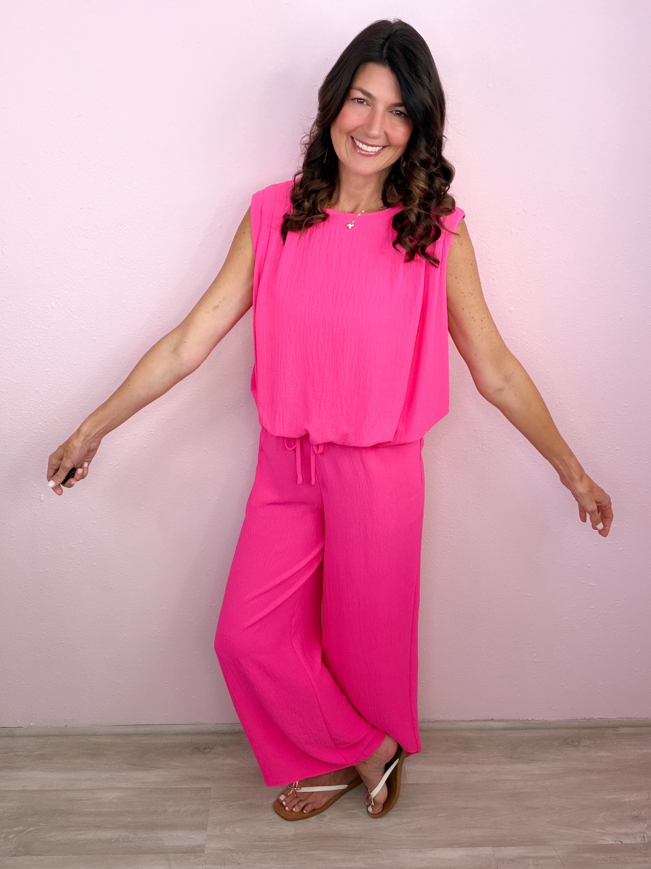 • PANTS: Self tie elasticized waist, wide leg style, side pockets, full length