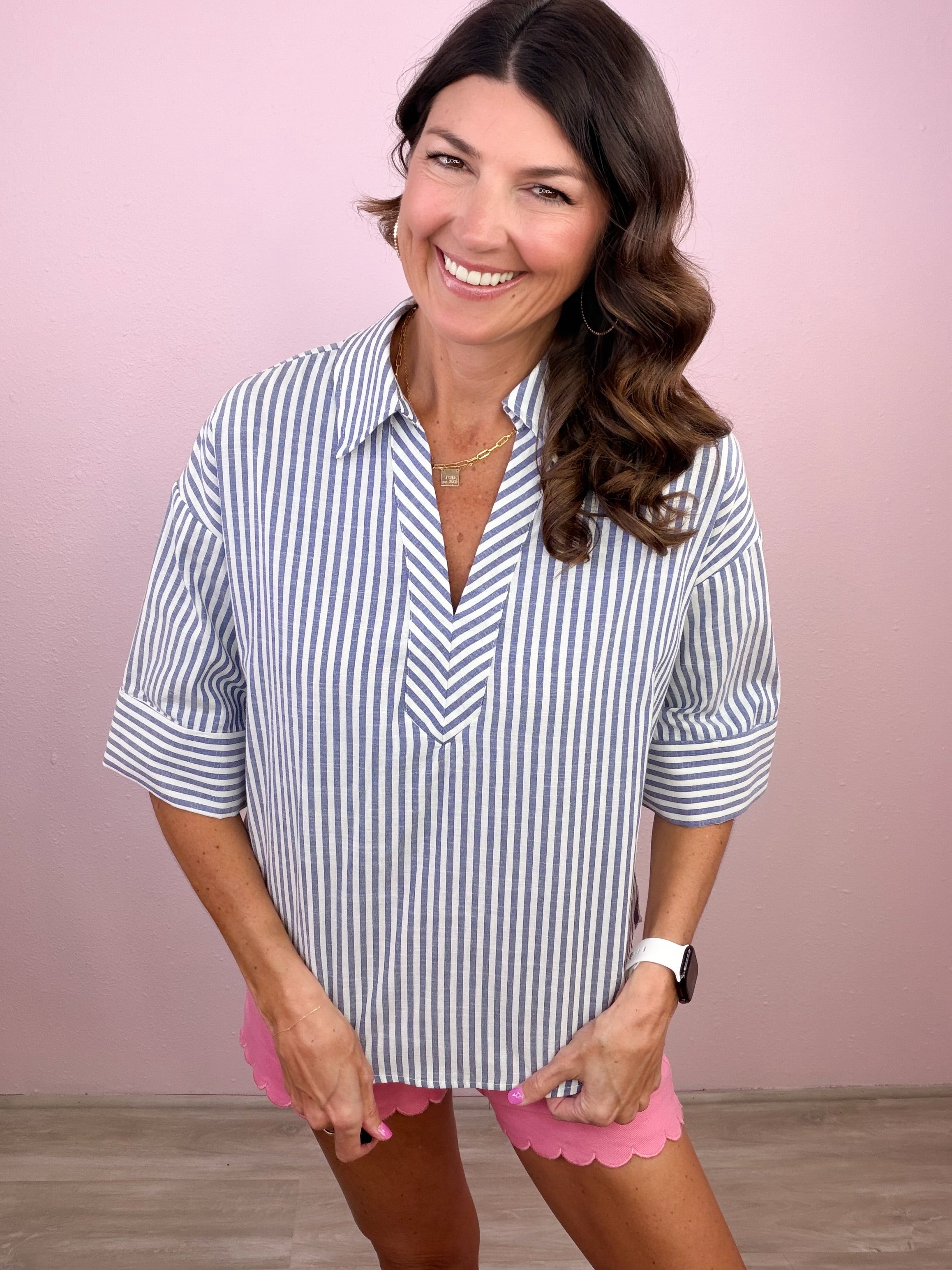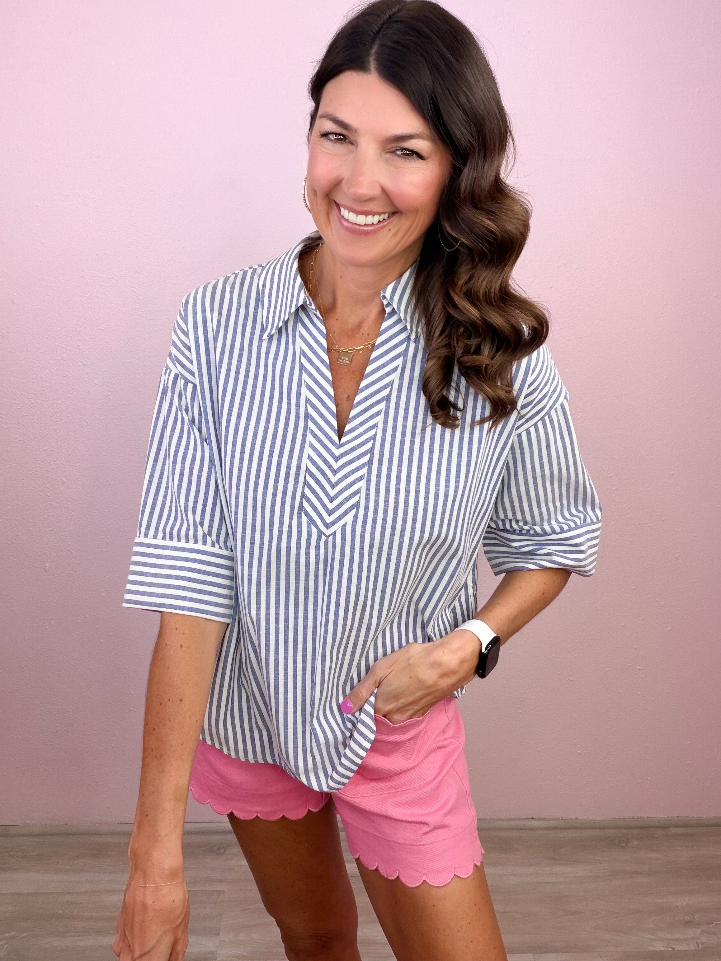 - Collared v neckline