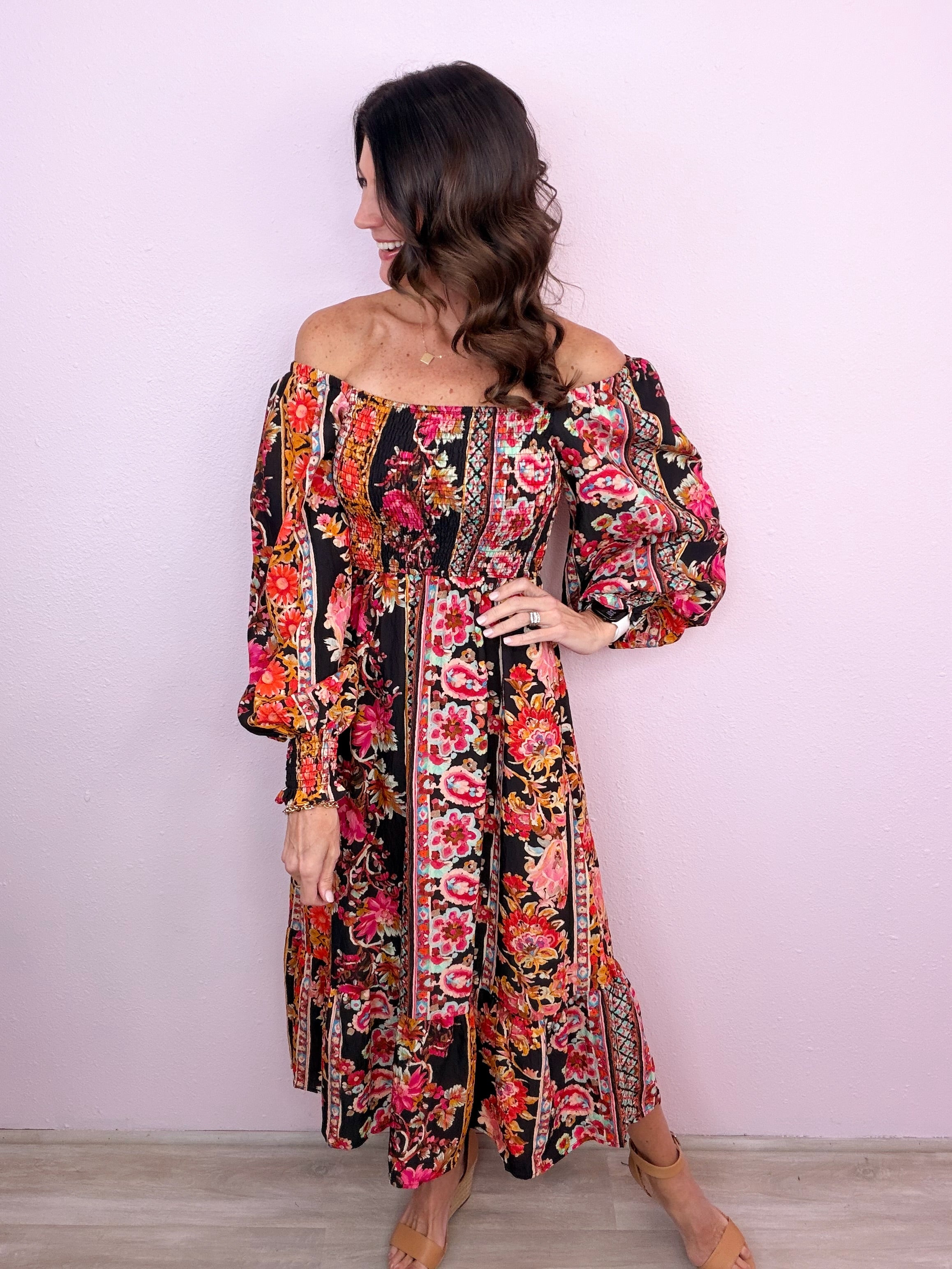 A dreamy boho number that we cannot get over! Stunning floral printed bohemian maxi dress with gathered sleeves, ruffle trim, and a flowy silhouette!