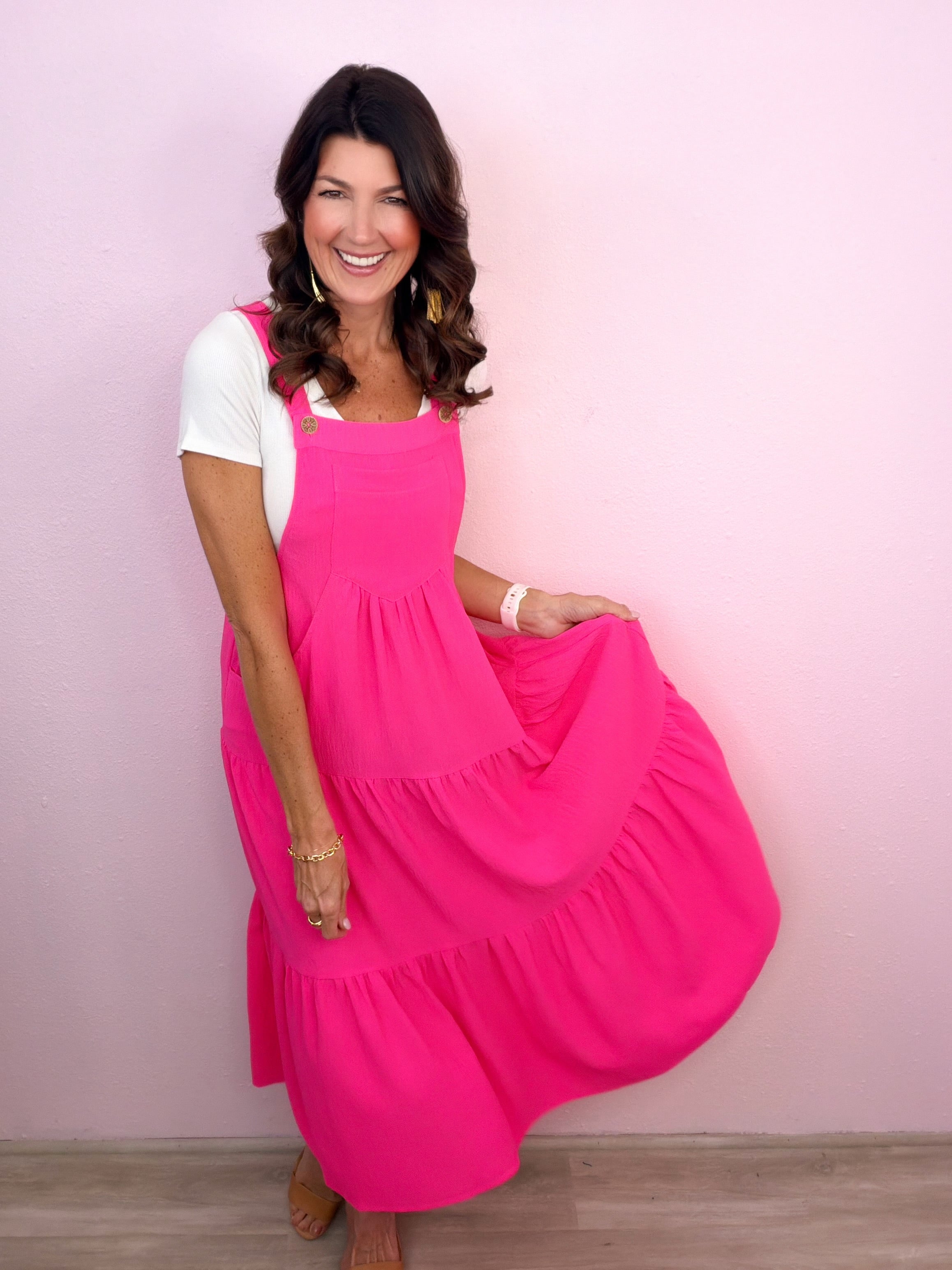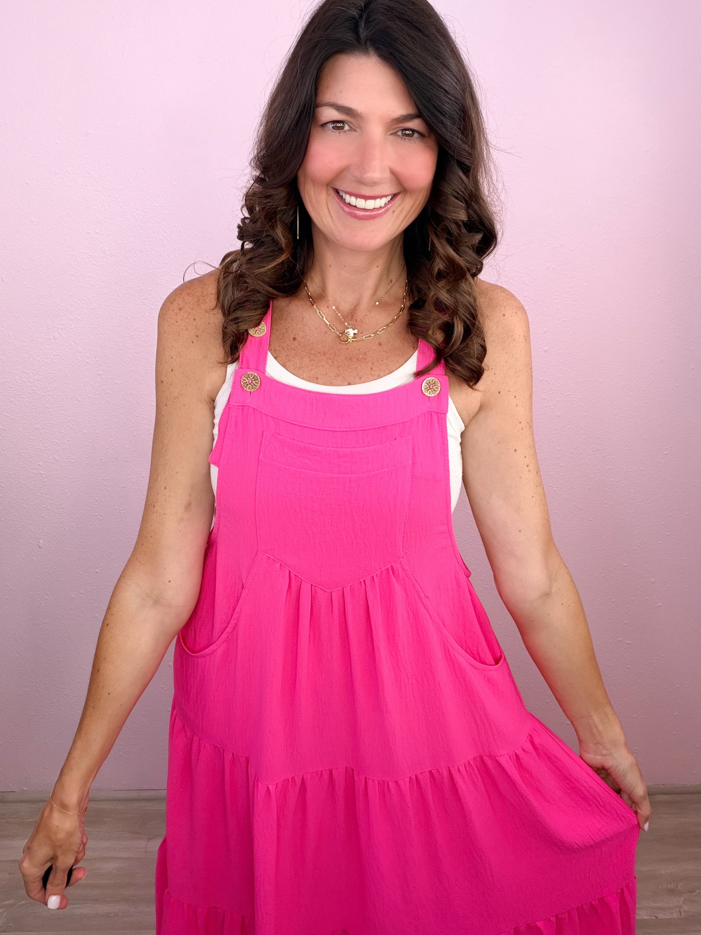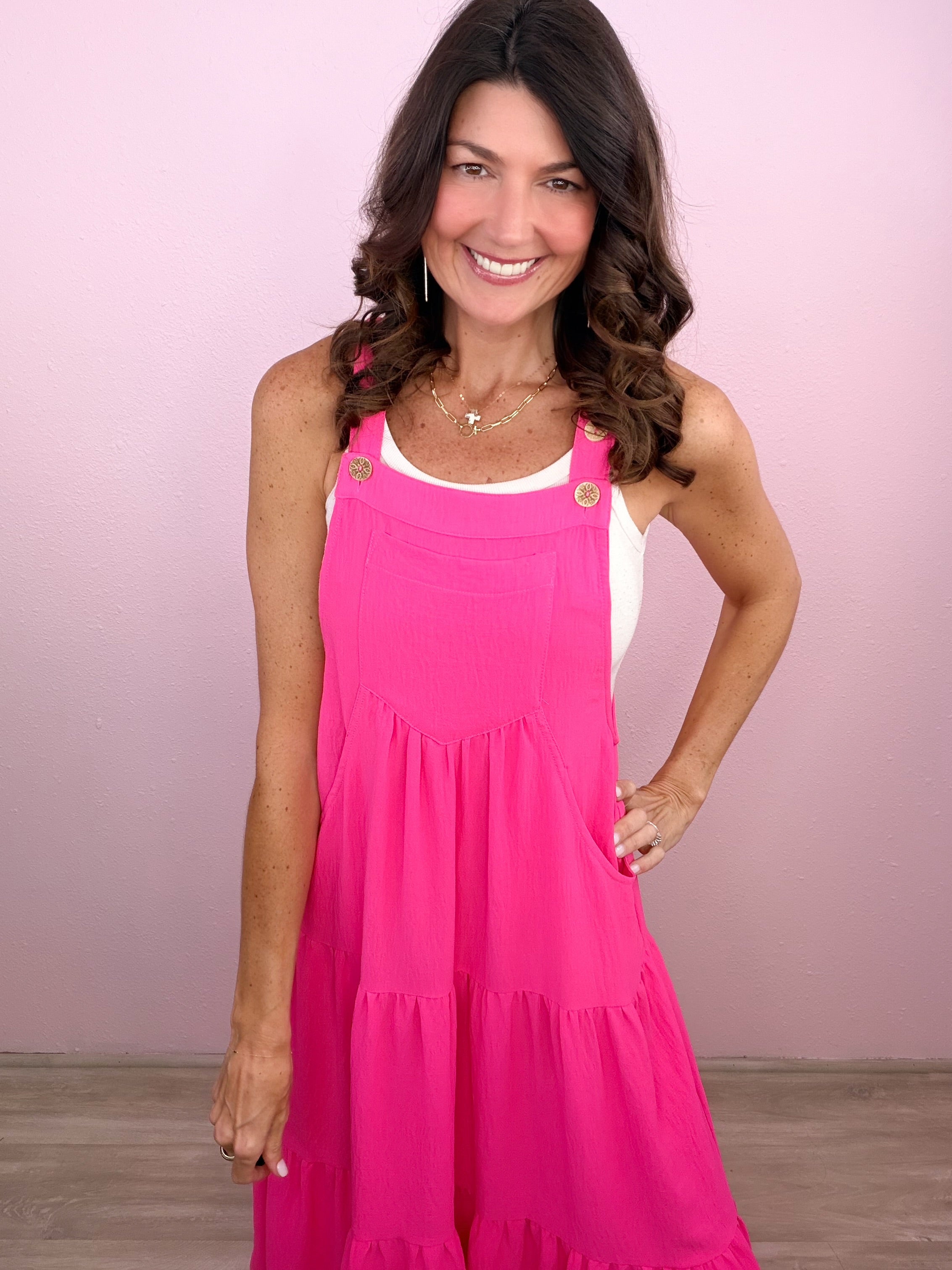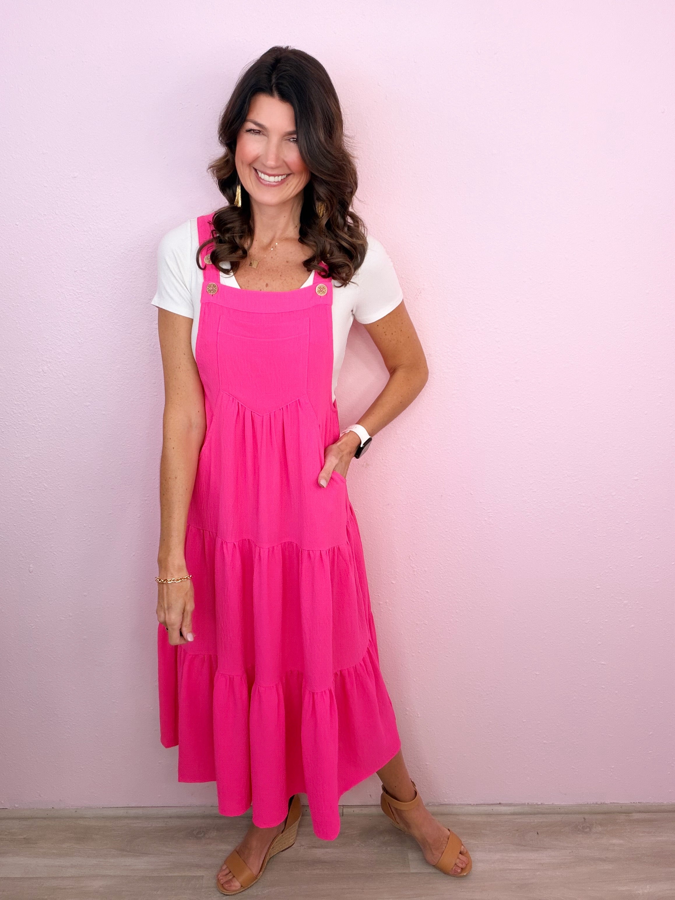 A casual cutie that needs no convincing! Solid button sling tiered midi dress with bust pocket and side pockets.