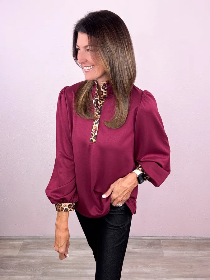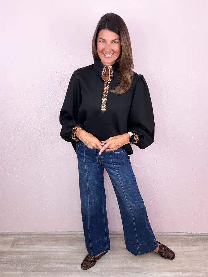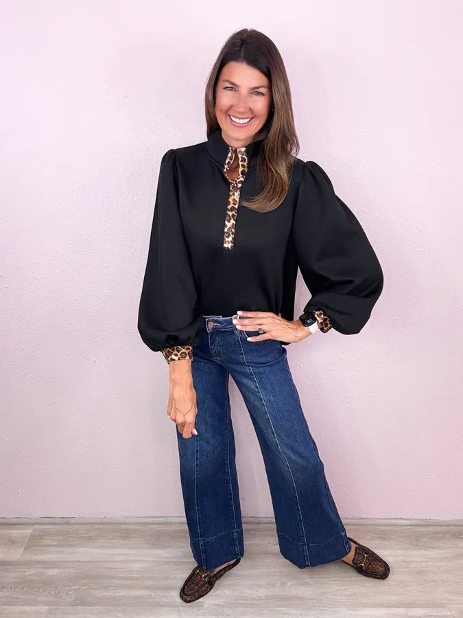 2 of our favorite trends all in one! We love a go-to solid and the leopard trim is the most perfect detail!