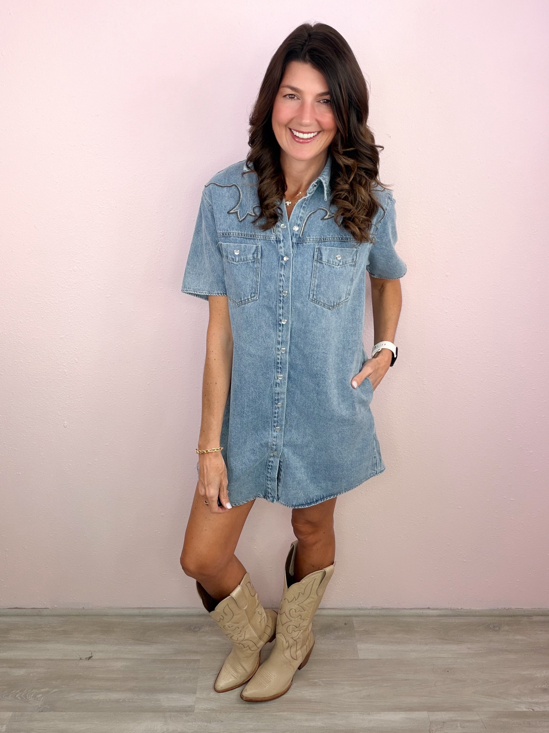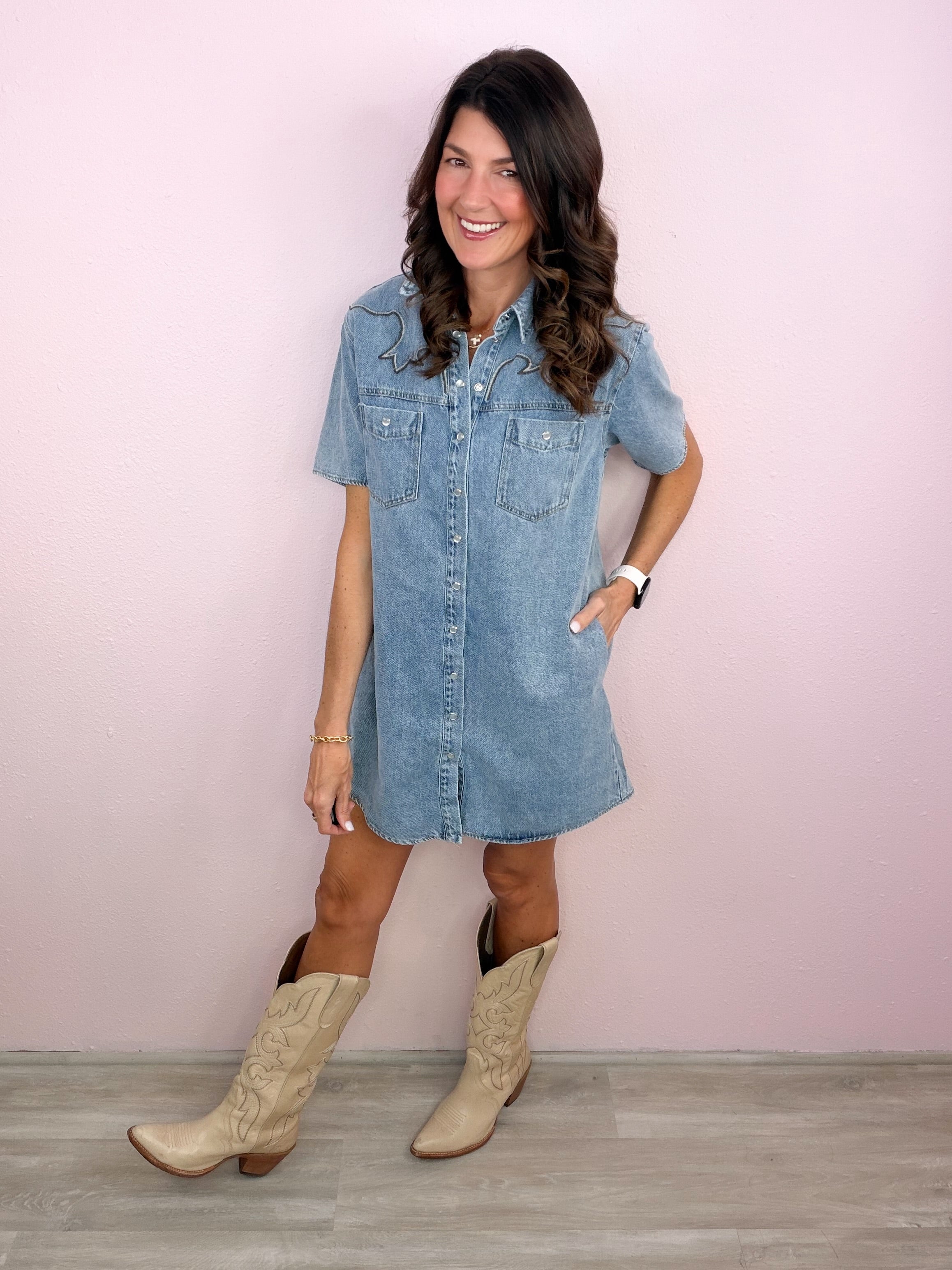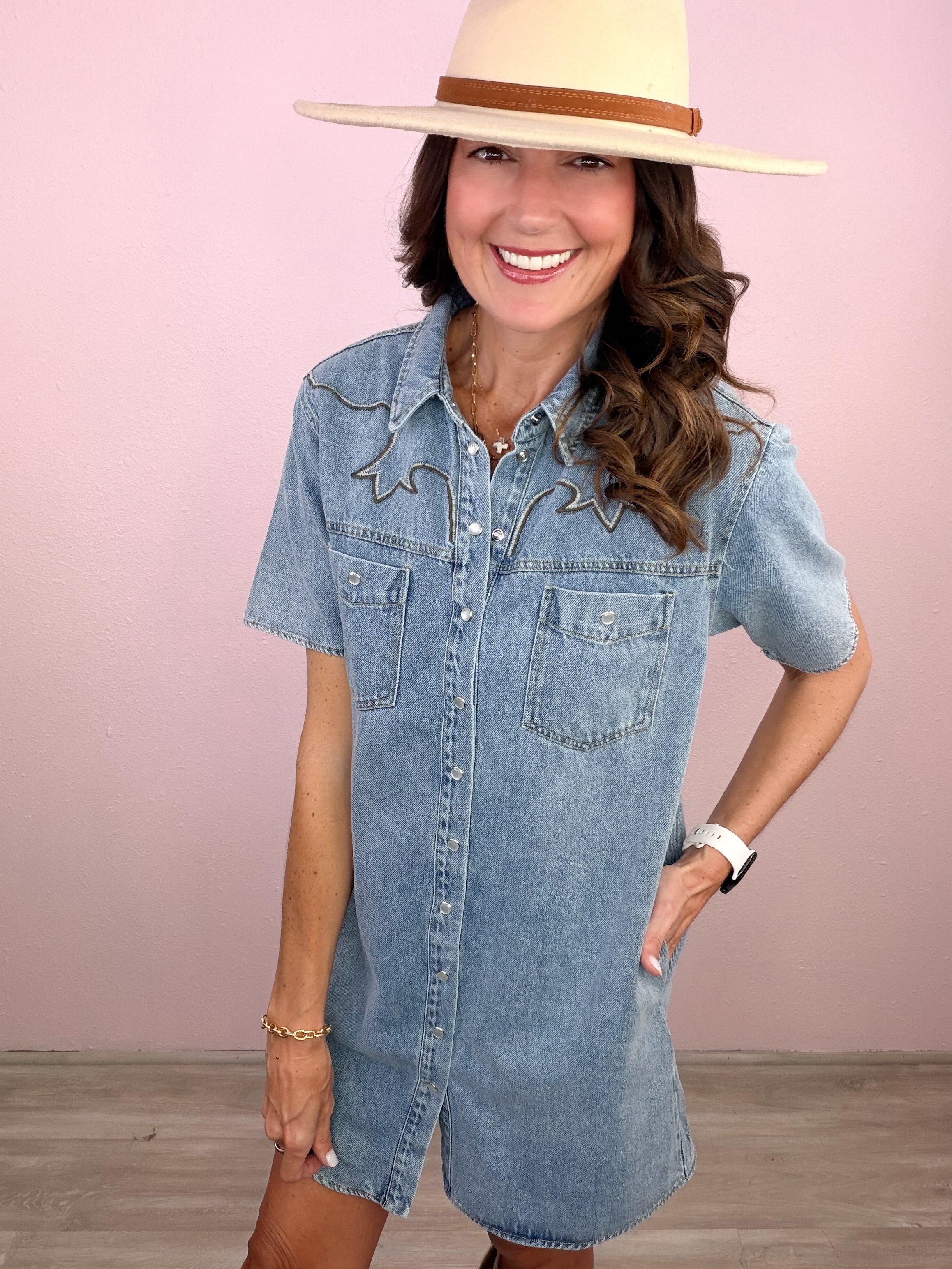 Western details, modern fit, & an instant yes! The denim dress that everyone is about to ask you about!