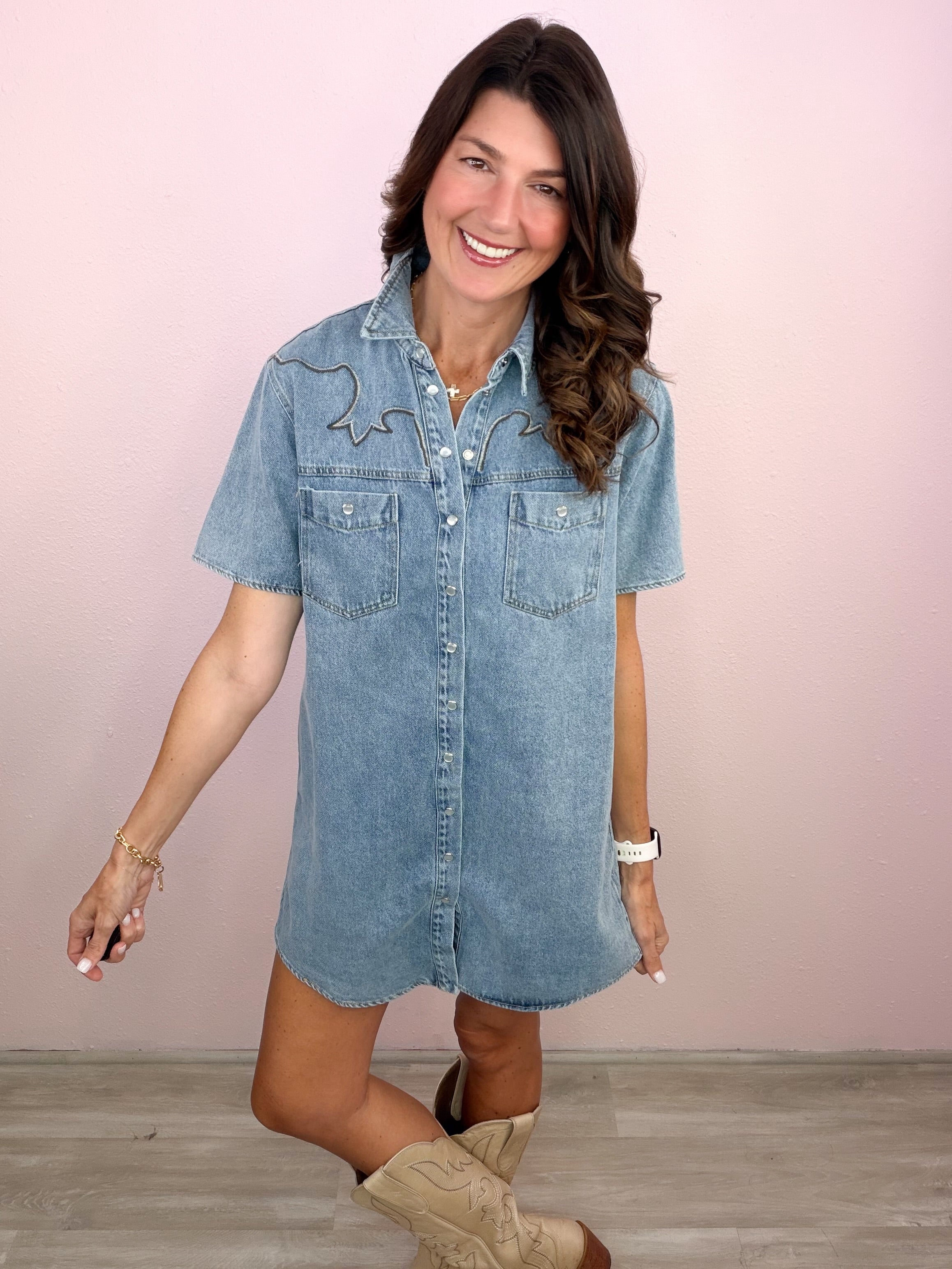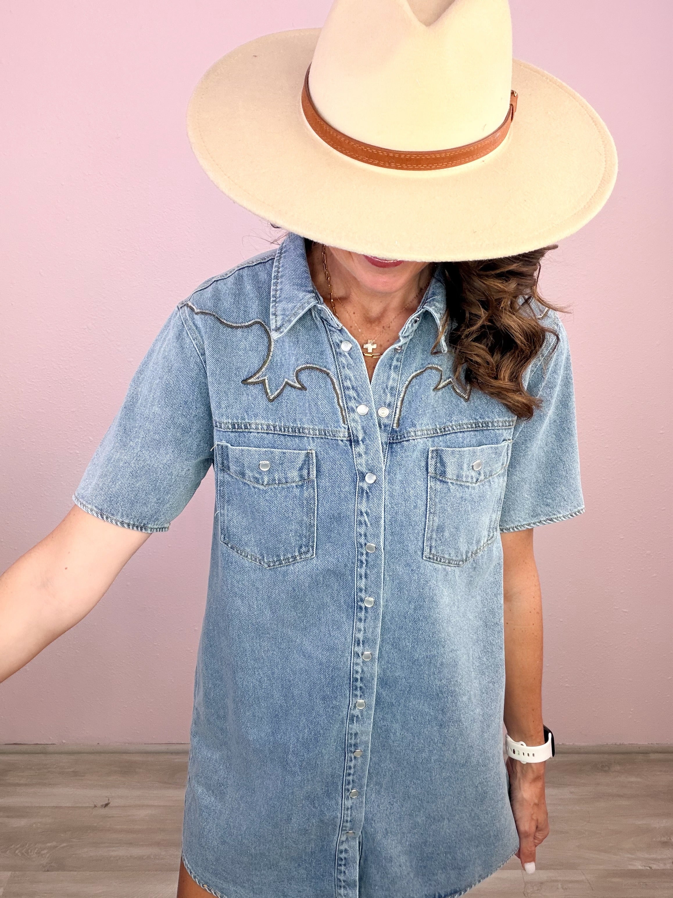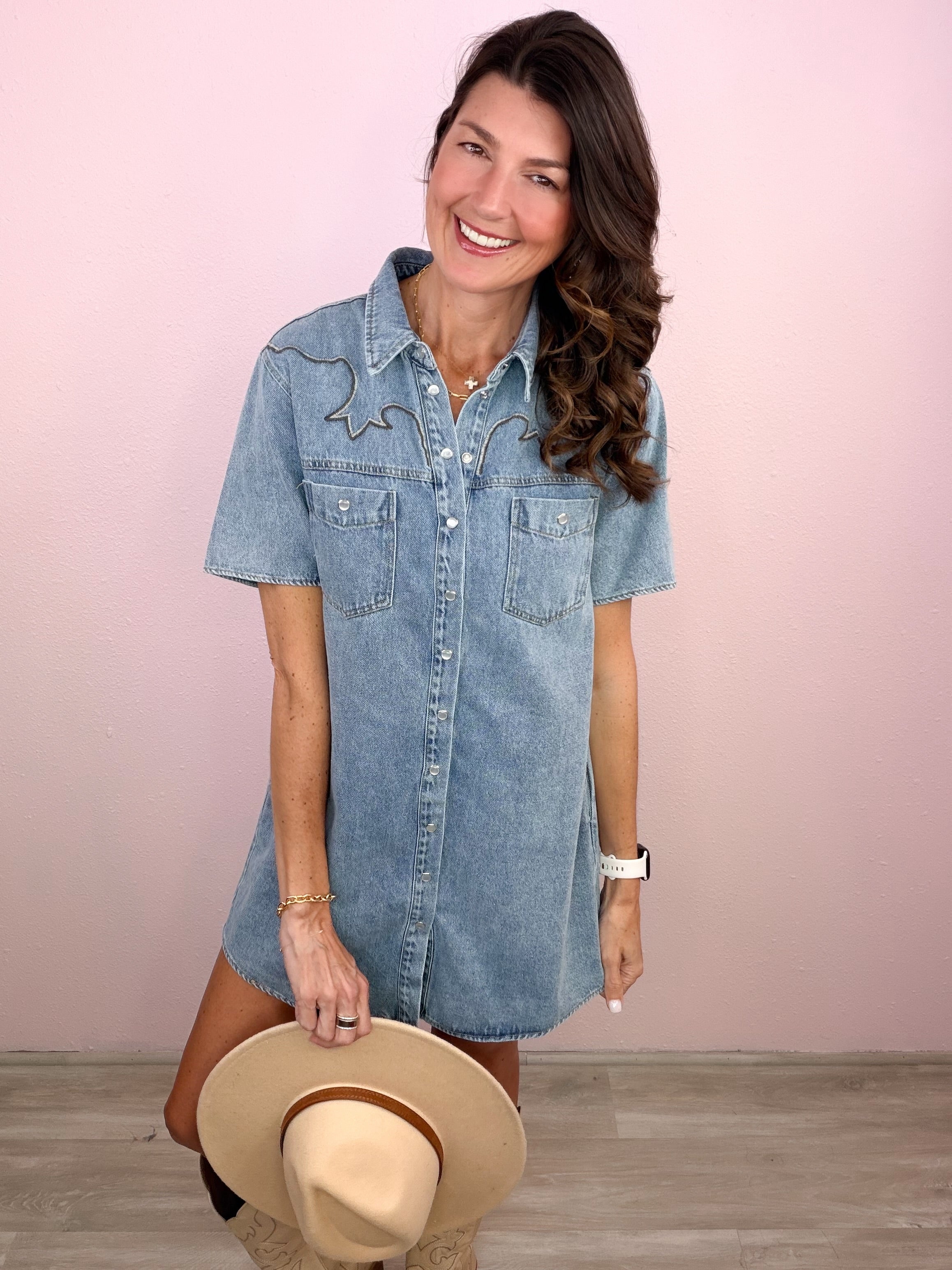 Western details, modern fit, & an instant yes! The denim dress that everyone is about to ask you about!