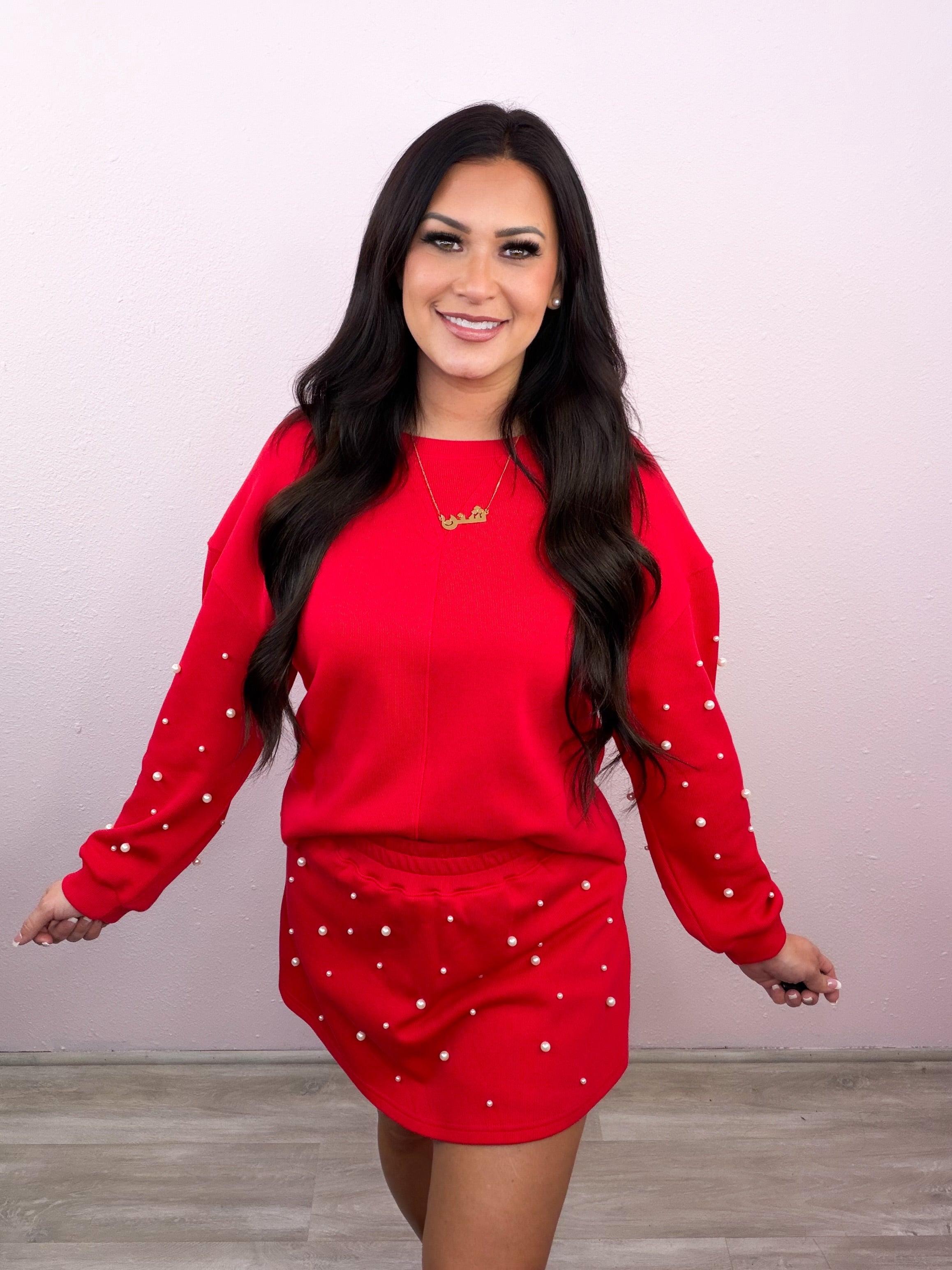 • Top: Crewneck style, pearls on the sleeves, comfort fit
