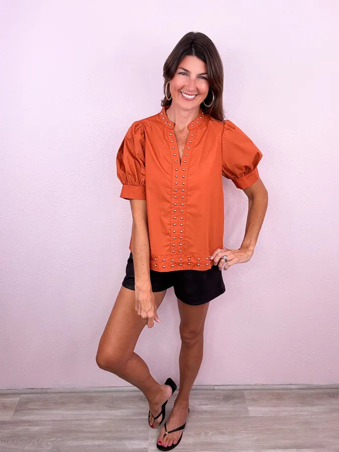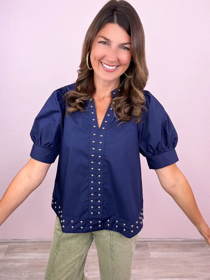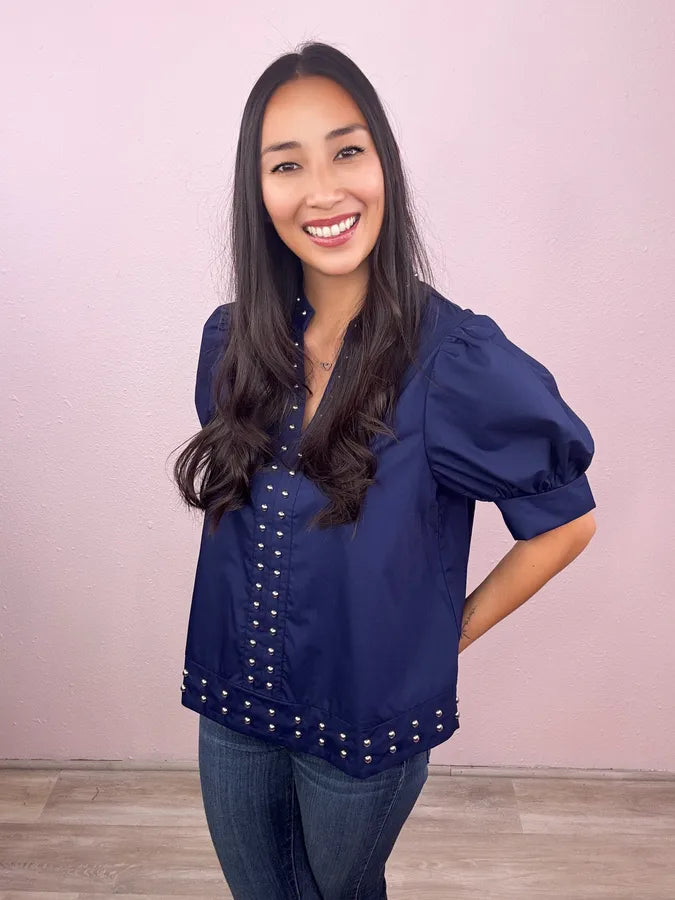 Easy going solid + the best details! That solid style you adore with trendy studded detailing!