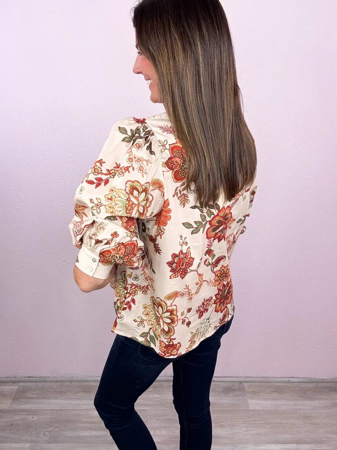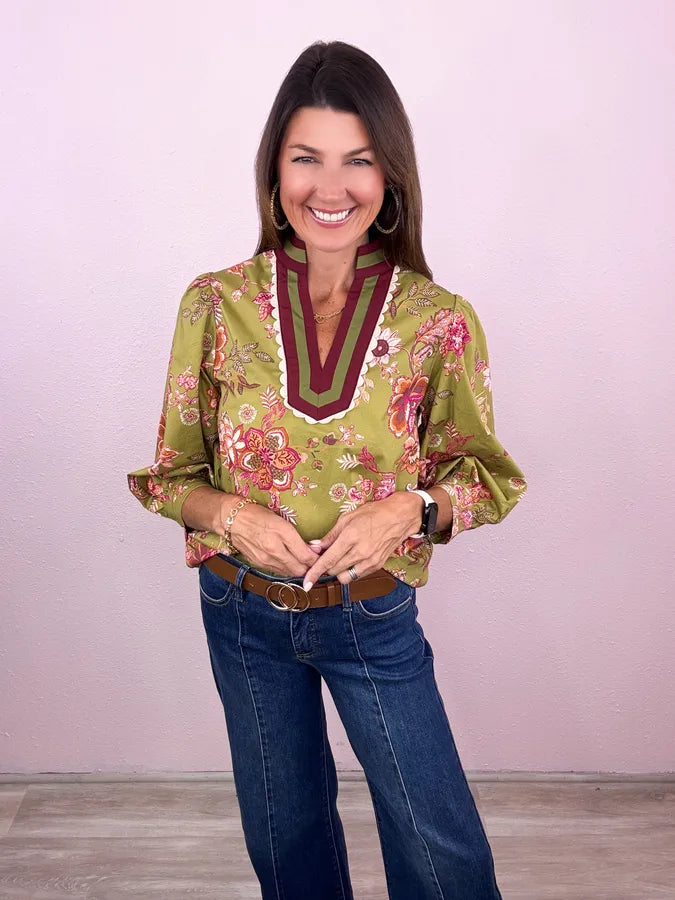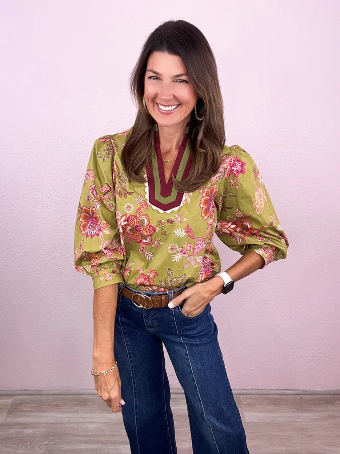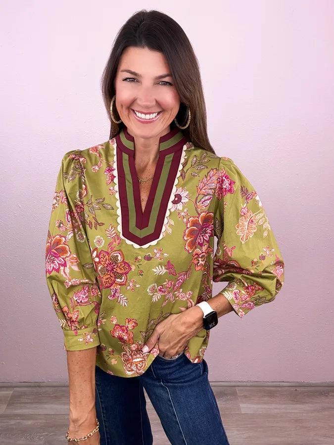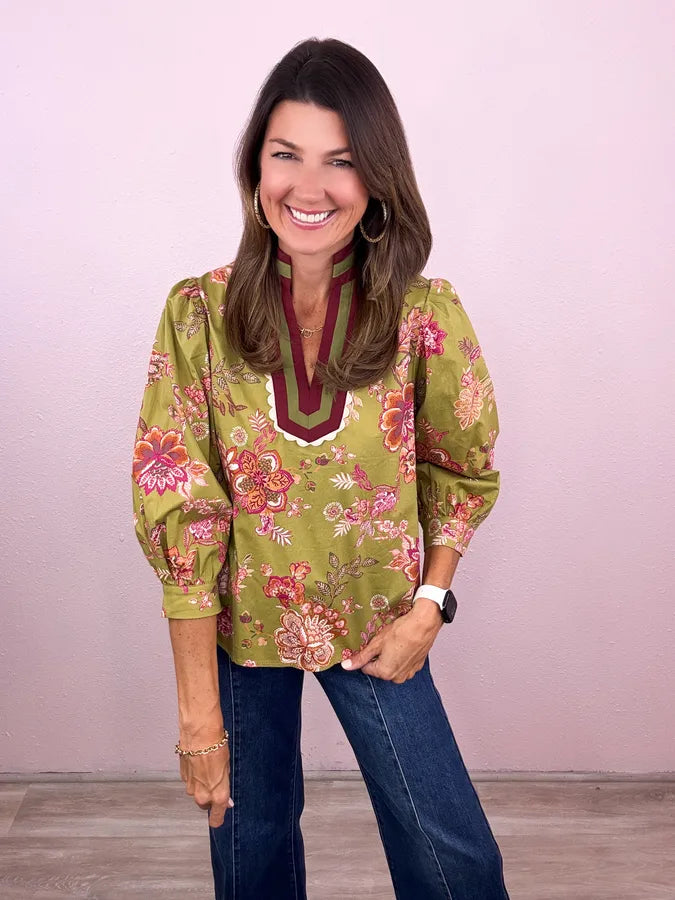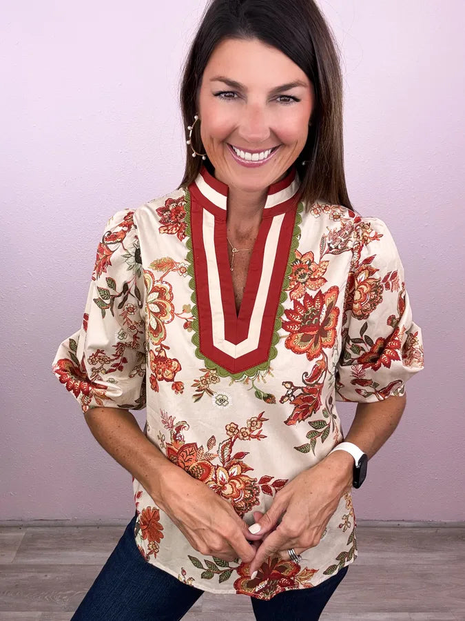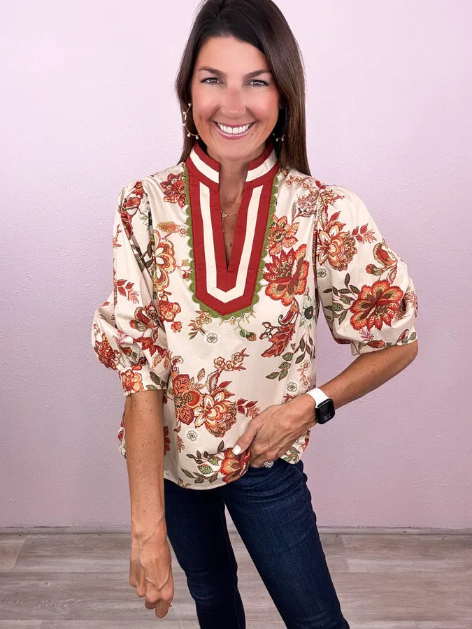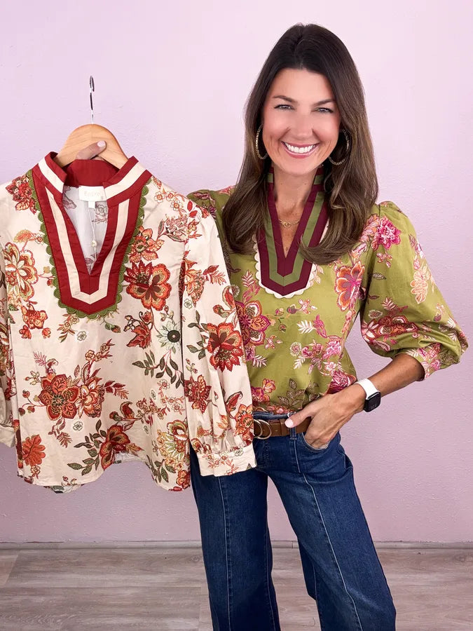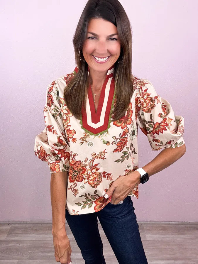 Radiates fall and always looks stunning! This is a tried and true style - premium floral meets trending contrast trim!