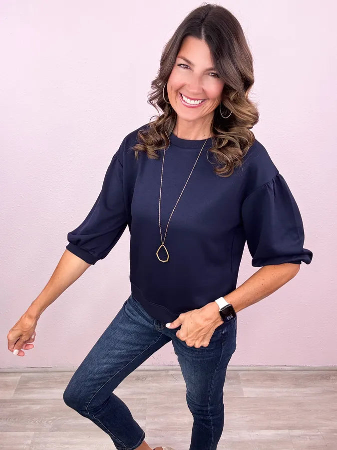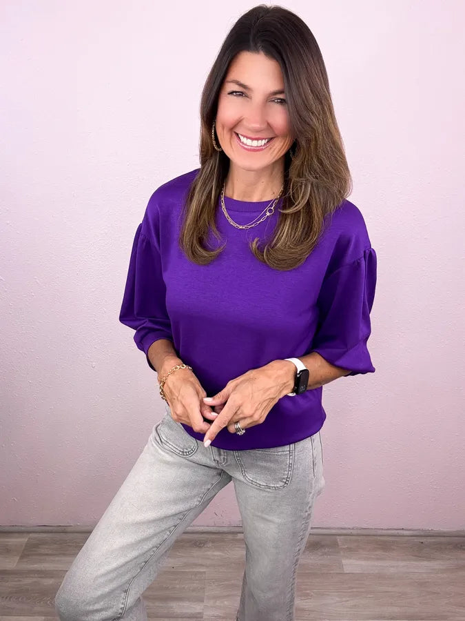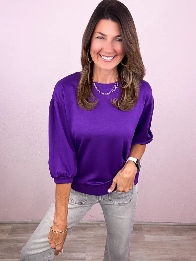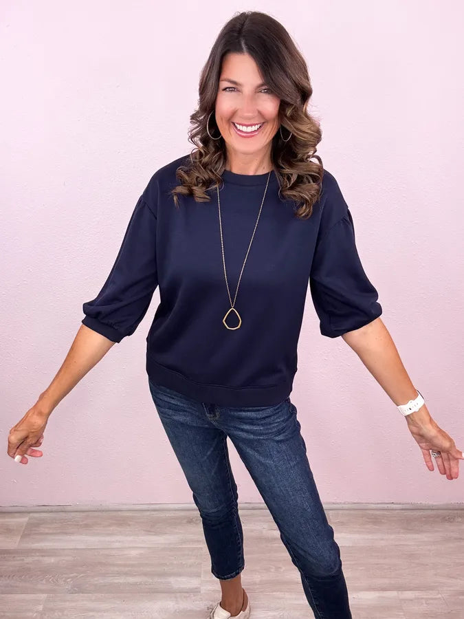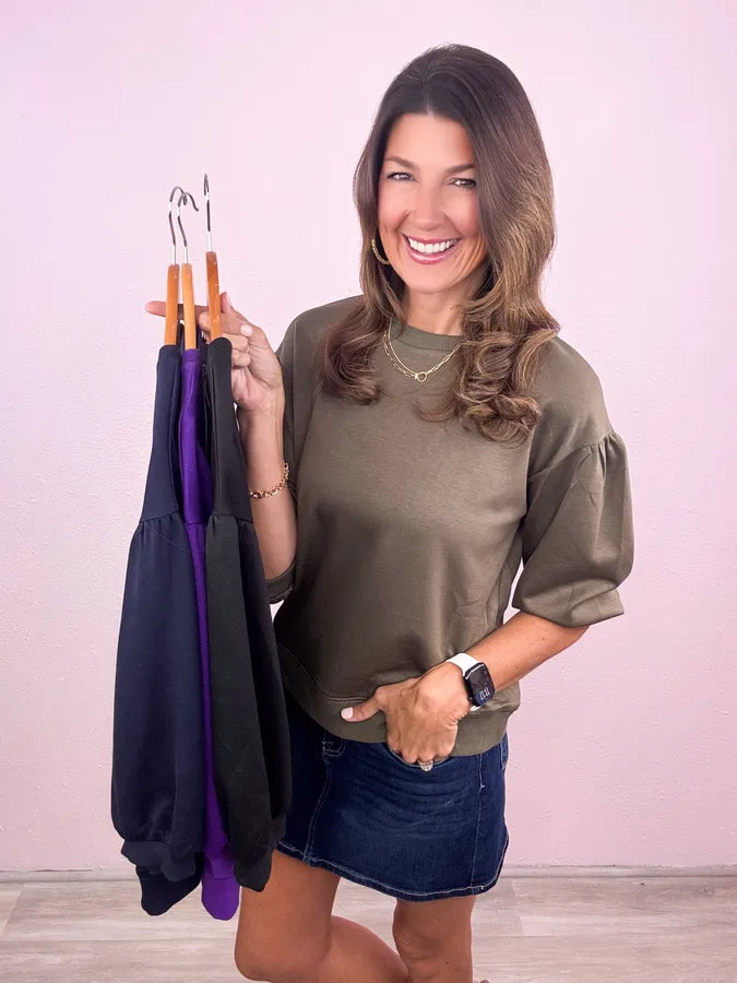 The top for all agendas! This solid sweatshirt top can do it all and you will love having it in your closet!