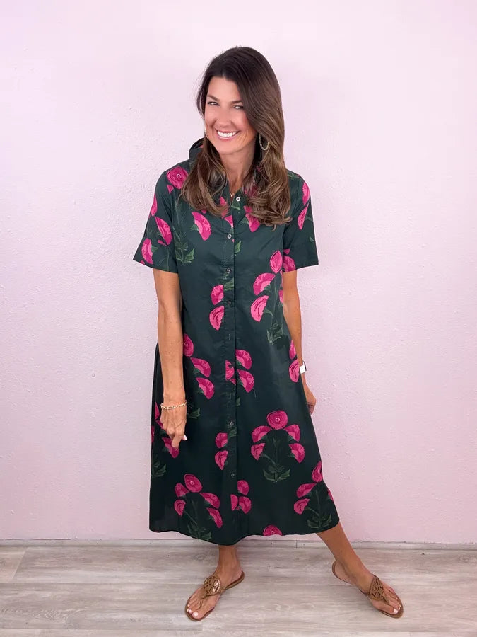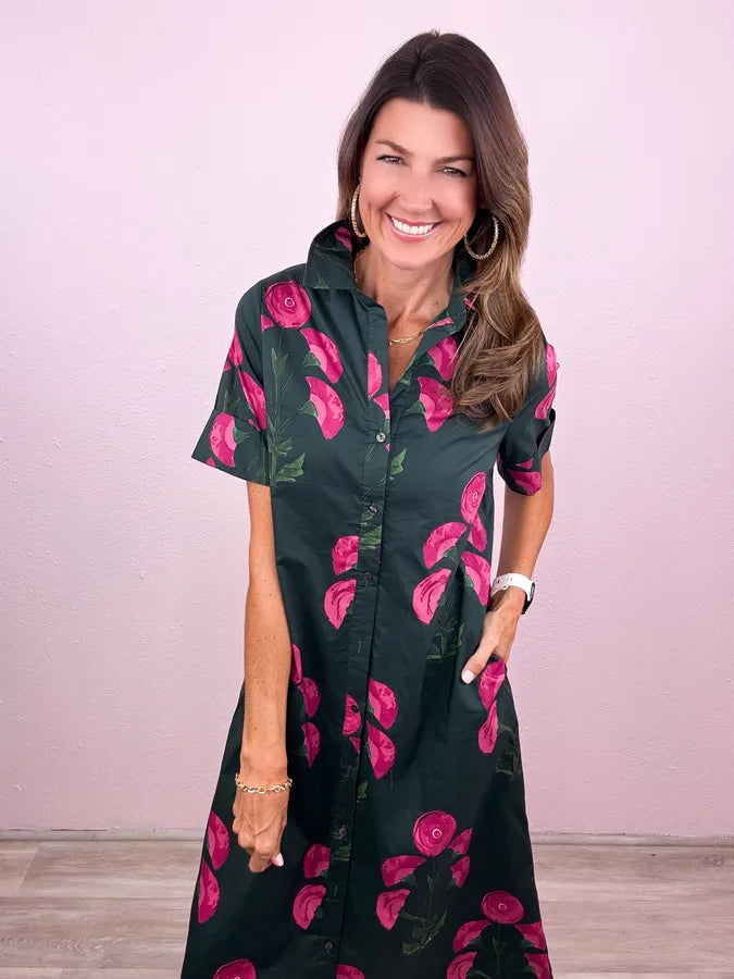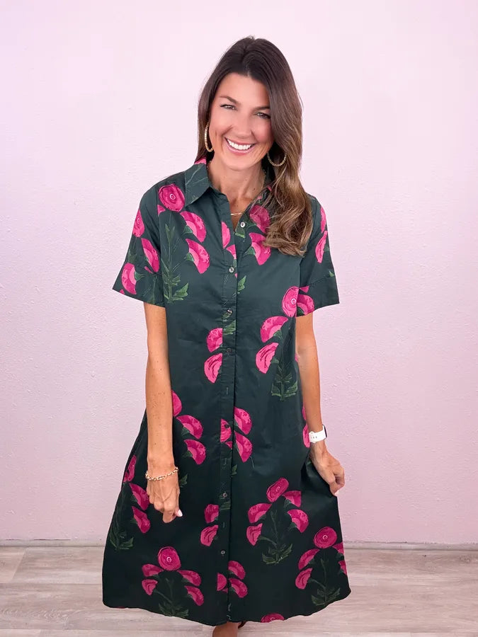 Immediately, add to cart! This classic collared midi in this new floral print is a fall dream you want to be apart of!