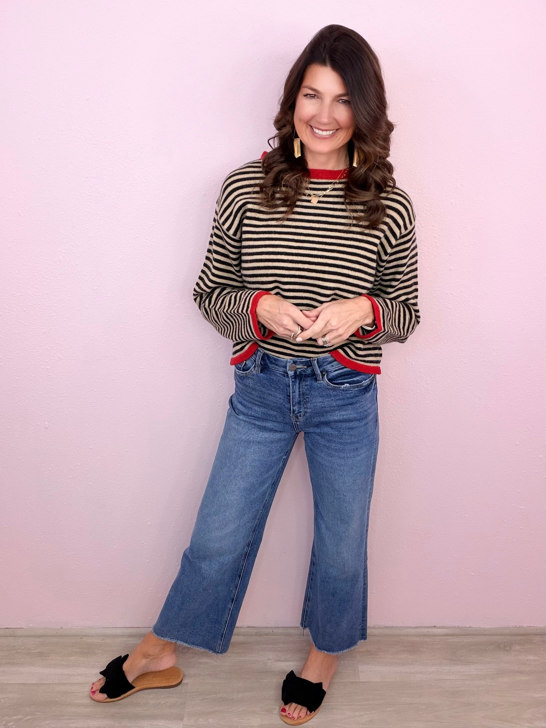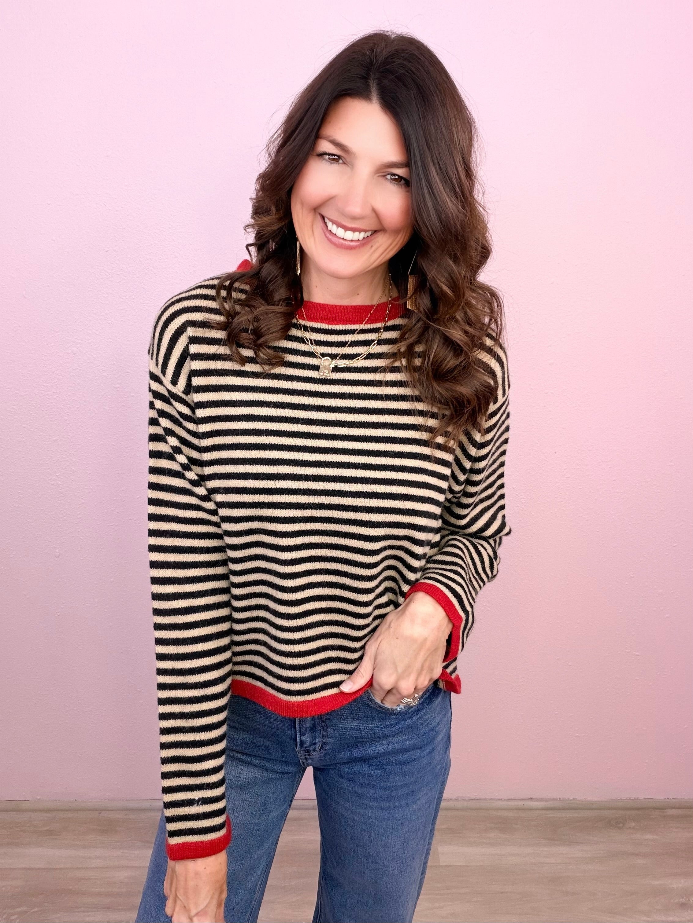 Classic stripes with a pop of color- this easy going sweater top is ready to transition with you!