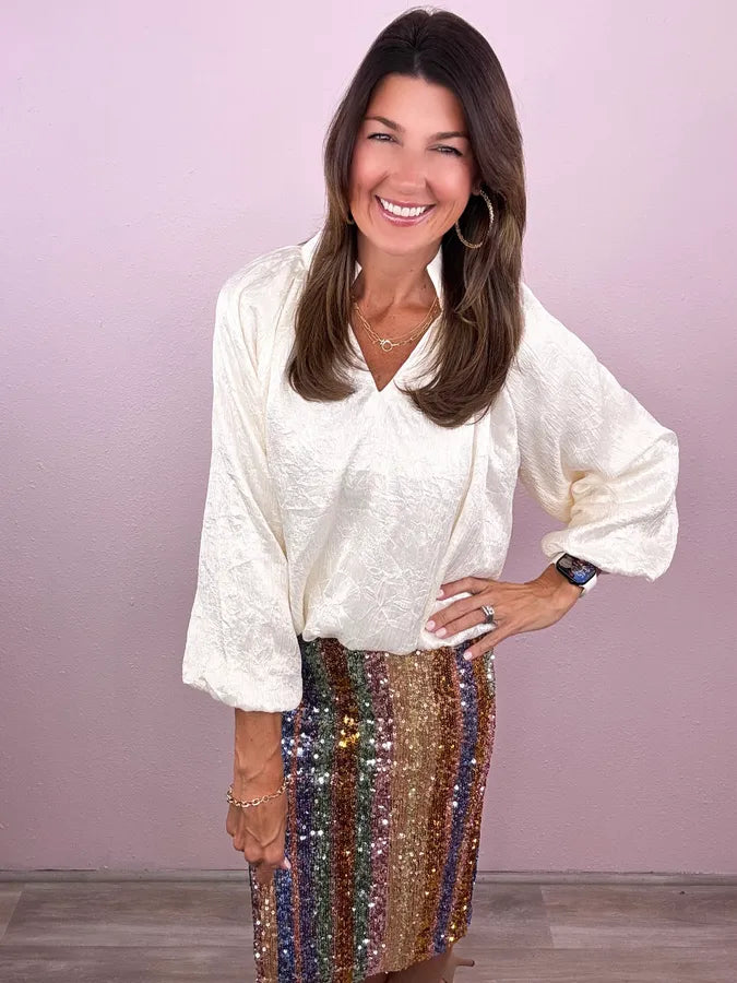 Saving the day over and over again! This shimmer detailed solid is ready for cute & casual or dressed up nights out!