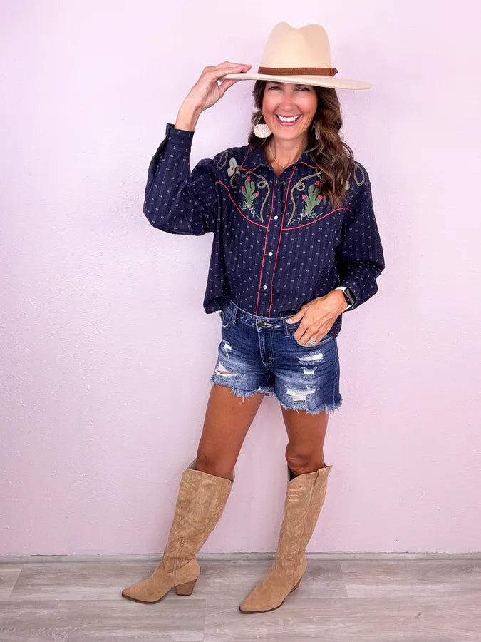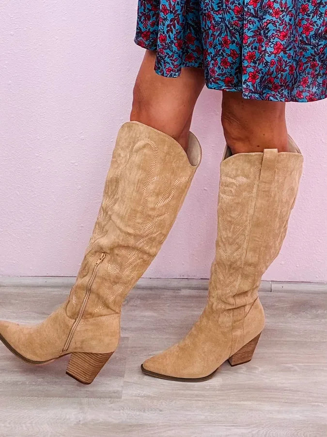 Classic cowboy embroidery on a suede cowboy boot that's been raised to the knees!